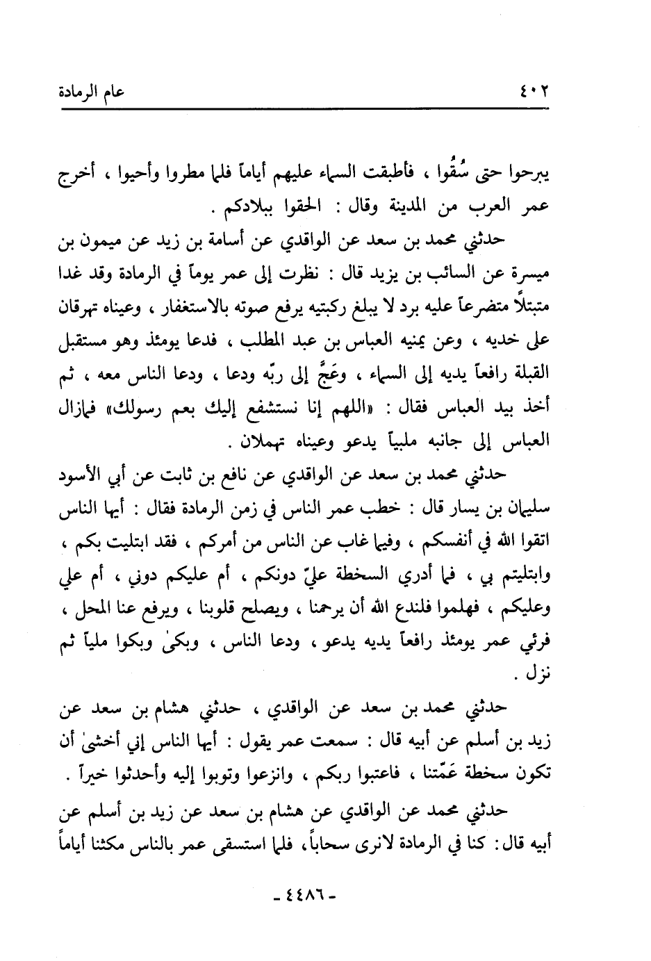 حدثني محمد بن سعد عن الواقدي عن أُسَامَةَ بْنِ زَيْدٍ عَنْ مَيْمُونَ بْنِ مَيْسَرَةَ عَنِ السَّائِبِ بْنِ يَزِيدَ قَالَ: نَظَرْتُ إِلَى عُمَرَ يَوْمًا فِي الرَّمَادَةِ وَقَدْ غَدَا مُتَبَتِّلا مُتَضَرِّعًا عَلَيْهِ بُرْدٌ لا يَبْلُغُ رُكْبَتَيْهِ يَرْفَعُ صَوْتَهُ بِالاسْتِغْفَارِ، وَعَيْنَاهُ تُهْرِقَانِ عَلَى خَدَّيْهِ، وَعَنْ يَمِينِهِ الْعَبَّاسُ بْنُ عَبْدِ الْمُطَّلِبِ، فَدَعَا يَوْمَئِذٍ وَهُوَ مُسْتَقْبِلٌ الْقِبْلَةَ رَافِعًا يَدَيْهِ إِلَى السَّمَاءِ، وَعَجَّ إِلَى رَبِّهِ وَدَعَا، وَدَعَا النَّاسَ مَعَهُ، ثُمَّ أَخَذَ بِيَدِ الْعَبَّاسِ فَقَالَ: «اللَّهُمَّ إِنَّا نَسْتَشْفِعُ إِلَيْكَ بِعَمِّ رَسُولِكَ» فَمَا زَالَ الْعَبَّاسُ إِلَى جَانِبِهِ مُلَبِّيًا يَدْعُو وَعَيْنَاهُ تَهْمِلانِ.