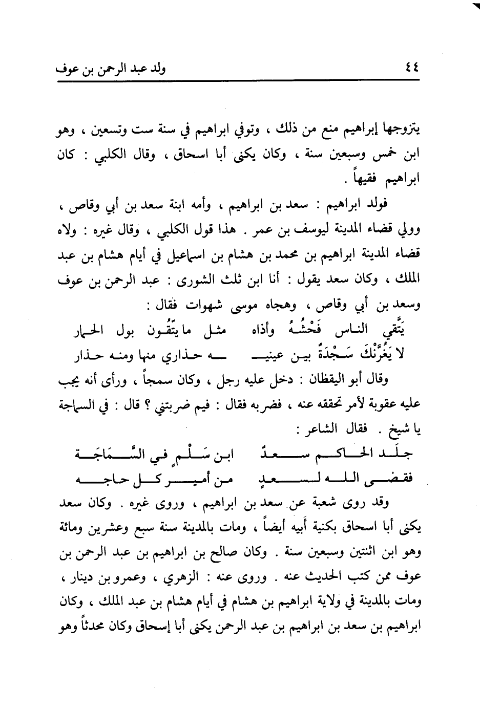 فولد إِبْرَاهِيم: سَعْد بْن إِبْرَاهِيمَ، وأمه ابنة سَعْد بْن أَبِي وَقَّاصٍ، وولي قضاء الْمَدِينَة ليوسف بْن عُمَرَ. هَذَا قول الْكَلْبِيّ، وَقَالَ غيره: ولاه قضاء الْمَدِينَة إِبْرَاهِيم بْن مُحَمَّدِ بْنِ هِشَام بْن إِسْمَاعِيل فِي أيام هِشَام بْن عَبْدِ الملك، وَكَانَ سَعْد يَقُول: أنا ابْن ثلث الشورى: عَبْد الرَّحْمَن بْن عَوْفٍ وَسَعْدَ بْن أَبِي وَقَّاصٍ، وهجاه مُوسَى شهوات فَقَالَ: