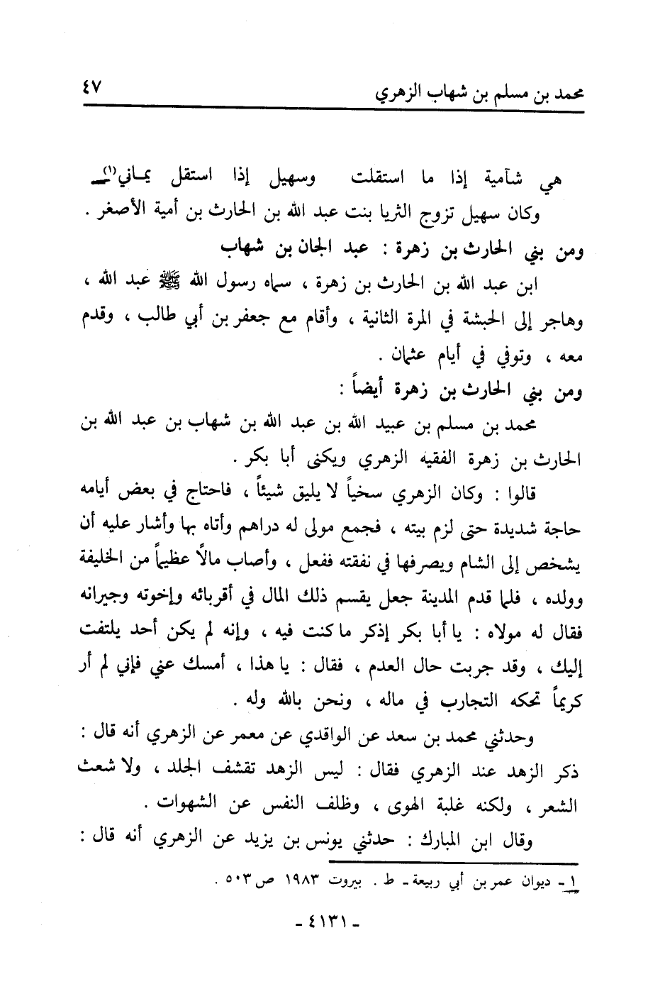 ومن بني الْحَارِث بْن زهرة أَيْضًا: مُحَمَّد بْن مُسْلِم بْن عُبَيْد اللَّه بْن عَبْدِ اللَّهِ بْن شهاب بْن عَبْدِ اللَّهِ بْنِ الْحَارِث بْن زهرة الفقيه الزُّهْرِيّ