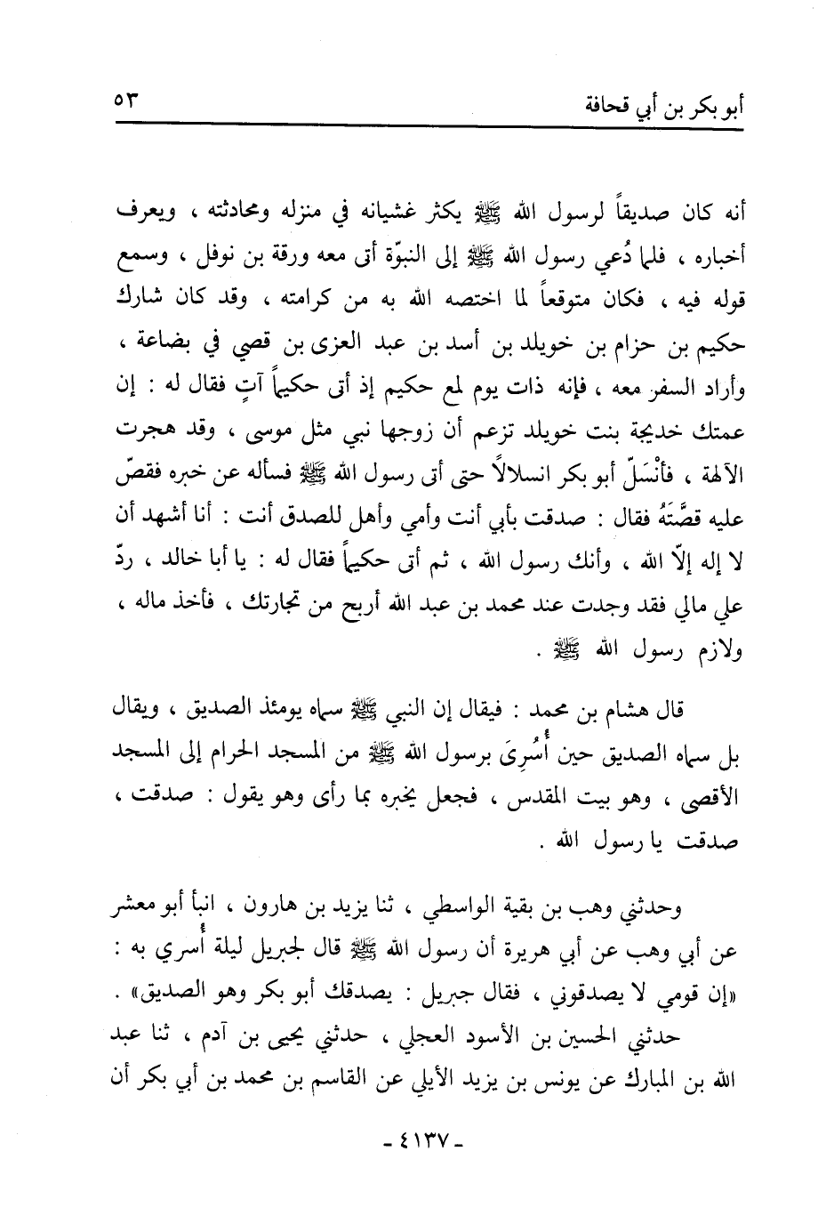 [ «إِنَّ قَوْمِي لا يُصَدِّقُونِي، فَقَالَ جِبْرِيلُ: يُصَدِّقُكَ أَبُو بَكْرٍ وَهُوَ الصِّدِّيقُ] .