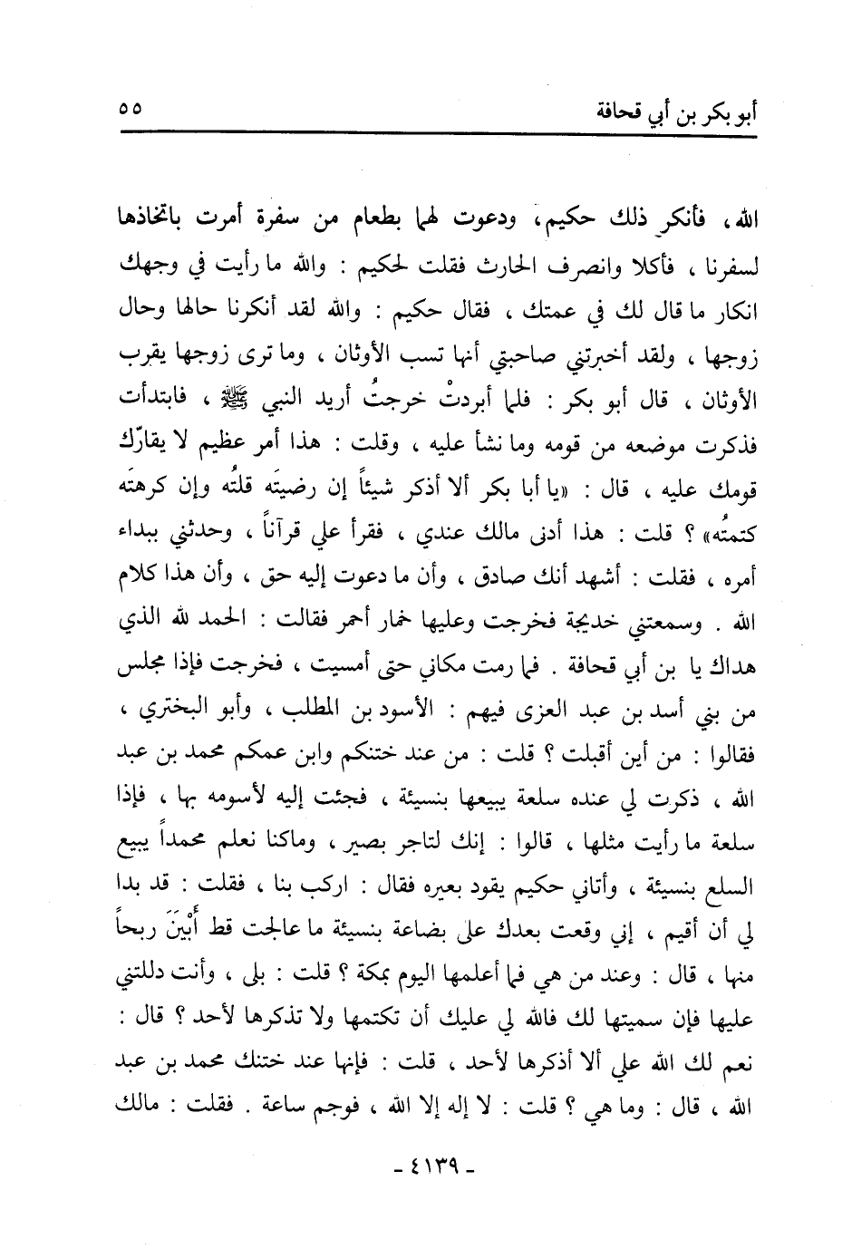 اللَّهِ، فَأَنْكَرَ ذَلِكَ حَكِيمٌ، وَدَعَوْتُ لَهُمَا بِطَعَامٍ مِنْ سَفْرَةٍ أَمَرْتُ بِاتِّخَاذِهَا لِسَفَرِنَا، فَأَكَلا وَانْصَرَفَ الْحَارِثُ فَقُلْتُ لِحَكِيمٍ: وَاللَّهِ مَا رَأَيْتُ فِي وَجْهِكَ إِنْكَارَ مَا قَالَ لَكَ فِي عَمَّتِكَ، فقال حكيم: وَاللَّهِ لَقَدْ أَنْكَرْنَا حَالَهَا وَحَالَ زَوْجِهَا، وَلَقَدْ أَخْبَرَتْنِي صَاحِبَتِي أَنَّهَا تَسُبُّ الأَوْثَانَ، وَمَا تَرَى زَوْجَهَا يَقْرُبُ الأَوْثَانَ، قَالَ أَبُو بَكْرٍ: فَلَمَّا أَبْرَدْتُ خَرَجْتُ أُرِيدُ النَّبِيَّ صَلَّى اللَّهُ عَلَيْهِ وَسَلَّمَ، فَابْتَدَأْتُ فَذَكَرْتُ مَوْضِعَهُ مِنْ قَوْمِهِ وَمَا نَشَأَ عَلَيْهِ، وَقُلْتُ: هَذَا أَمْرٌ عَظِيمٌ لا يُقَارُّكَ قَوْمُكَ عَلَيْهِ، قَالَ: [ «يَا أَبَا بَكْرٍ أَلا أَذْكُرُ شَيْئًا إِنْ رَضِيتَهُ قُلْتَهُ وَإِنْ كَرِهْتَهُ كَتَمْتَهُ» ؟] قُلْتُ: هَذَا أَدْنَى مَالِكَ عِنْدِي، فَقَرَأَ عَلَيَّ قُرْآنًا، وَحَدَّثَنِي بِبِدَاءِ أَمْرِهِ، فَقُلْتُ: أَشْهَدُ أَنَّكَ صَادِقٌ، وَأَنَّ مَا دَعَوْتَ إِلَيْهِ حَقٌّ، وَأَنَّ هَذَا كَلامُ اللَّهِ. وَسَمِعَتْنِي خَدِيجَةُ فَخَرَجَتْ وَعَلَيْهَا خِمَارٌ أَحْمَرُ فَقَالَتْ: الْحَمْدُ لِلَّهِ الذي هداك يا بن أَبِي قُحَافَةَ. فَمَا رُمْتُ مَكَانِي حَتَّى أَمْسَيْتُ، فَخَرَجْتُ فَإِذَا مَجْلِسٌ مِنْ بَنِي أَسَدِ بْنِ عبد العزى فيهم: الأسود بن الْمُطَّلِبِ، وَأَبُو الْبَخْتَرِيِّ، فَقَالُوا: مِنْ أَيْنَ أَقْبَلْتَ؟ قُلْتُ: مِنْ عِنْدِ خَتَنِكُمْ وَابْنِ عَمِّكُمْ مُحَمَّدِ بْنِ عَبْدِ اللَّهِ، ذَكَرْتُ لِي عِنْدَهُ سِلْعَةً يَبِيعُهَا بِنَسِيئَةٍ، فَجِئْتُ إِلَيْهِ لأَسُومَهُ بِهَا، فَإِذَا سِلْعَةٌ مَا رَأَيْتُ مِثْلَهَا، قَالُوا: إِنَّكَ لَتَاجِرٌ بَصِيرٌ، وَمَا كُنَّا نَعْلَمُ مُحَمَّدًا يَبِيعُ السِّلَعَ بِنَسِيئَةٍ، وَأَتَانِي حَكِيمٌ يَقُودُ بَعِيرَهُ فَقَالَ: ارْكَبْ بِنَا، فَقُلْتُ: قَدْ بَدَا لِي أَنْ أُقِيمَ، إِنِّي وَقَعْتُ بَعْدَكَ عَلَى بِضَاعَةٍ بِنَسِيئَةٍ مَا عَالَجْتُ قَطُّ أَبْيَنَ رِبْحًا مِنْهَا، قَالَ: وَعِنْدَ مَنْ هِيَ فَمَا أَعْلَمُهَا الْيَوْمَ بِمَكَّةَ؟ قُلْتُ: بلى، وَأَنْت دَلَلْتَنِي عَلَيْهَا فَإِنْ سَمَّيْتُهَا لَكَ فَاللَّهُ لِي عَلَيْكَ أَنْ تَكْتُمَهَا وَلا تَذْكُرْهَا لأَحَدٍ؟ قَالَ: