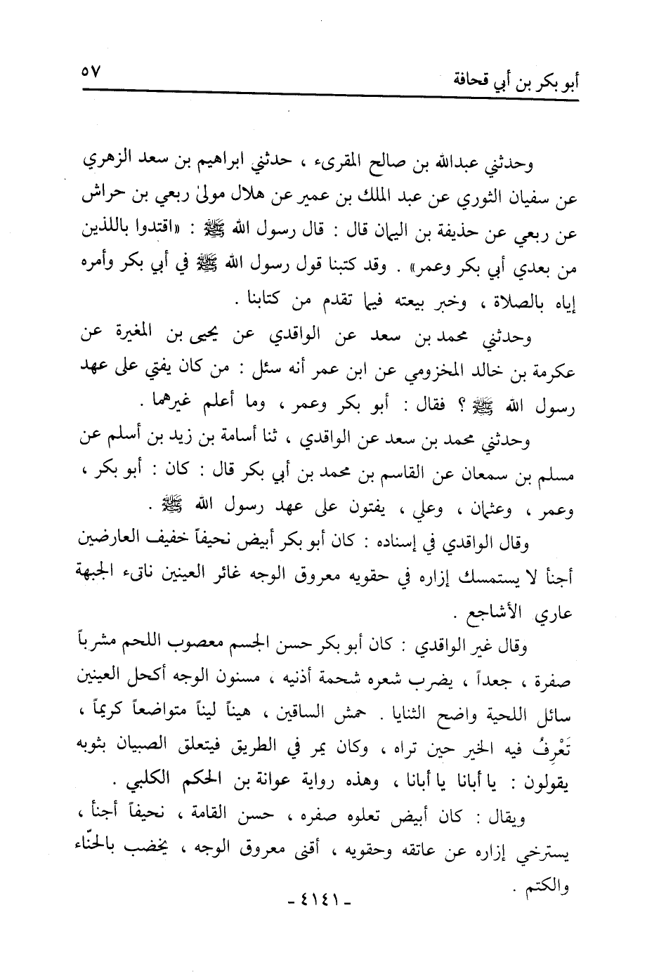 وَقَالَ الْوَاقِدِيُّ فِي إسناده: كَانَ أَبُو بَكْر أبيض نحيفا خفيف العارضين أجنأ لا يستمسك إزاره فِي حقويه معروق الْوَجْهِ غَائِرَ الْعَيْنَيْنِ نَاتِئَ الْجَبْهَةِ عَارِيَ الأَشَاجِعِ.