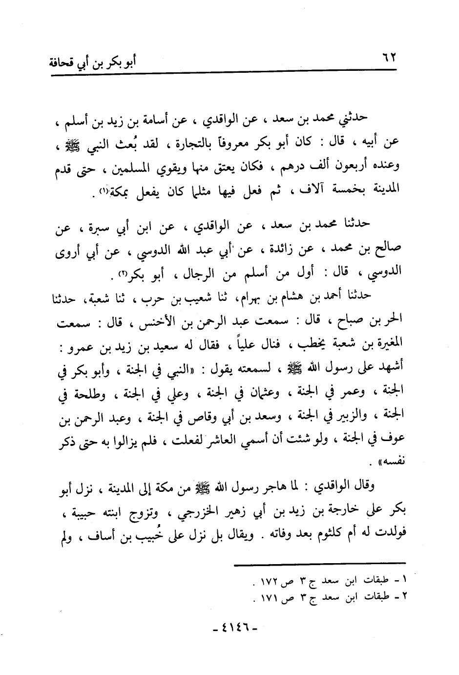 حدثني محمد بن سعد، عن الواقدي، عن أسامة بْن زيد بْن أسلم، عن أبيه، قَالَ: كَانَ أَبُو بَكْرٍ مَعْرُوفًا بِالتِّجَارَةِ، لَقَدْ بُعِثَ النَّبِيُّ صَلَّى اللَّهُ عَلَيْهِ وَسَلَّمَ، وَعِنْدَهُ أَرْبَعُونَ أَلْفَ دِرْهَمٍ، فَكَانَ يُعْتِقُ مِنْهَا وَيُقَوِّي الْمُسْلِمِينَ، حَتَّى قَدِمَ الْمَدِينَةَ بِخَمْسَةِ آلافٍ، ثُمَّ فَعَلَ فِيهَا مِثْلَمَا كَانَ يَفْعَلُ بِمَكَّةَ [1] .