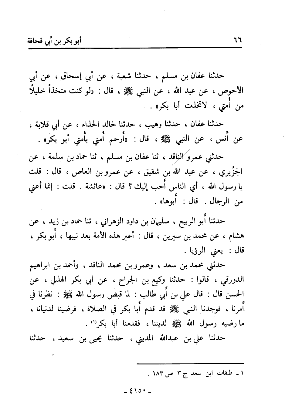 حَدَّثَنِي مُحَمَّدُ بْنُ سَعْدٍ، وَعَمْرُو بْن مُحَمَّد النَّاقِد، وَأَحْمَدُ بْن إِبْرَاهِيمَ الدَّوْرَقِيّ، قَالُوا: حَدَّثَنَا وَكِيعُ بْنُ الْجَرَّاحِ، عَن أَبِي بَكْرٍ الْهُذَلِيِّ، عَن الْحَسَنِ قَالَ: قَالَ عَلِيُّ بْنُ أَبِي طَالِبٍ: [لَمَّا قُبِضَ رَسُولُ اللَّهِ صَلَّى اللَّهُ عَلَيْهِ وَسَلَّمَ: نَظَرْنَا فِي أَمْرِنَا، فَوَجَدْنَا النَّبِيَّ صَلَّى اللَّهُ عَلَيْهِ وَسَلَّمَ قَدْ قَدَّمَ أَبَا بَكْرٍ فِي الصَّلاةِ، فَرَضِينَا لِدُنْيَانَا، مَا رَضِيَهُ رَسُولُ اللَّهِ صَلَّى اللَّهُ عَلَيْهِ وَسَلَّمَ لِدِينِنَا، فَقَدَّمْنَا أَبَا بَكْر] [1] .