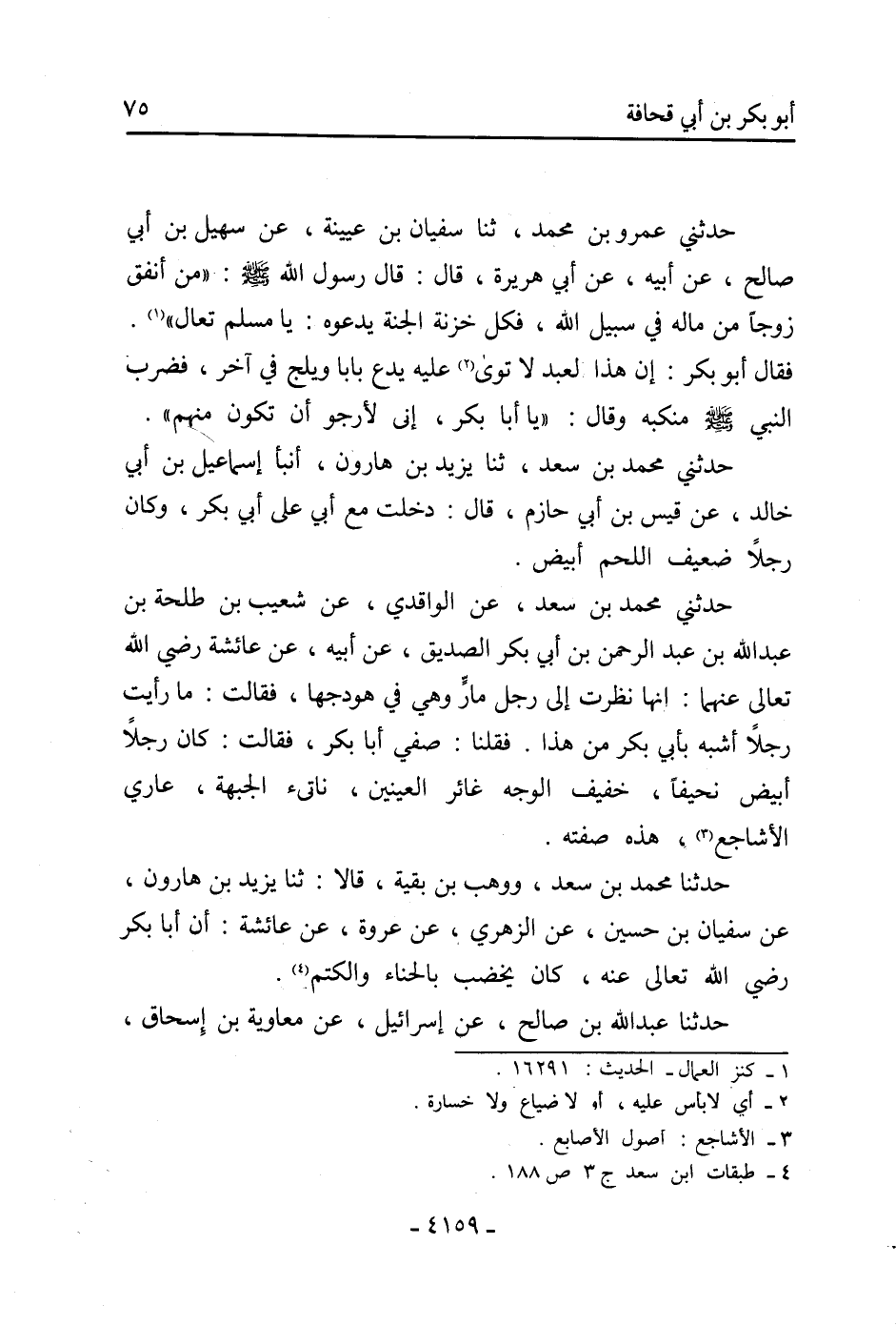 حَدَّثَنِي مُحَمَّدُ بْنُ سَعْدٍ، عَنِ الْوَاقِدِيِّ، عَنْ شُعَيْبِ بْن طَلْحَة بْن عَبْدِ اللَّهِ بْنِ عَبْدِ الرَّحْمَنِ بْن أبي بَكْرٍ الصِّدِّيقِ، عَنْ أَبِيهِ، عَنْ عَائِشَةَ رَضِيَ اللَّهُ تَعَالَى عَنْهُمَا: أَنَّهَا نَظَرَتْ إِلَى رَجُلٍ مَارٍّ وَهِيَ فِي هَوْدَجِهَا، فَقَالَتْ: مَا رَأَيْتُ رَجُلا أَشْبَهَ بأَبِي بَكْرٍ مِنْ هَذَا. فَقُلْنَا: صِفِي أَبَا بَكْرٍ، فَقَالَتْ: كَانَ رَجُلا أَبْيَضَ نَحِيفًا، خَفِيفَ الْوَجْهِ غَائِرَ الْعَيْنَيْنِ، نَاتِئَ الْجَبْهَةِ، عَارِيَ الأَشَاجِعِ [3] ، هَذِهِ صِفَتُهُ.