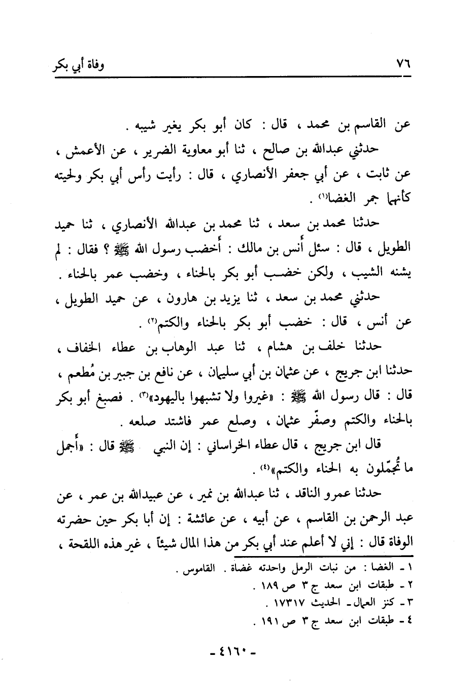 حَدَّثَنِي مُحَمَّدُ بْنُ سَعْدٍ، ثنا يَزِيدُ بْنُ هَارُونَ، عَنْ حُمَيْدٍ الطَّوِيلِ، عَنْ أَنَسٍ، قَالَ: خَضَّبَ أَبُو بَكْرٍ بِالْحِنَّاءِ وَالْكَتَمِ [2] .