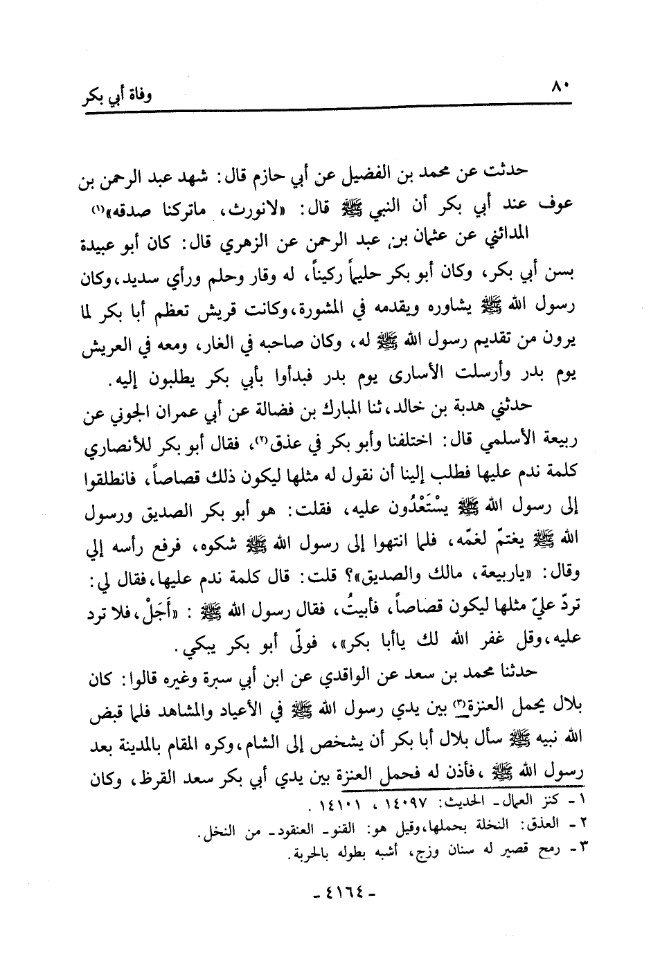 حَدَّثَنَا مُحَمَّدُ بْنُ سَعْدٍ عَنِ الْوَاقِدِيِّ عَنِ ابْنِ أَبِي سَبْرَةَ وَغَيْرِهِ قَالُوا: كَانَ بِلالٌ يَحْمِلُ الْعَنَزَةَ [3] بَيْنَ يَدَيْ رَسُول اللَّهِ صَلَّى اللَّهُ عَلَيْهِ وَسَلَّمَ فِي الأَعْيَادِ وَالْمَشَاهِدِ فَلَمَّا قَبَضَ اللَّهُ نَبِيَّهُ صَلَّى اللَّهُ عَلَيْهِ وَسَلَّمَ سَأَلَ بِلالٌ أَبَا بَكْرٍ أَنْ يَشْخَصَ إِلَى الشَّامِ، وَكَرِهَ الْمَقَامَ بِالْمَدِينَةِ بَعْدَ رَسُولِ اللَّهِ صَلَّى اللَّهُ عَلَيْهِ وَسَلَّمَ، فَأَذِنَ لَهُ فَحَمَلَ الْعَنَزَةَ بَيْنَ يَدَيْ أَبِي بَكْرِ سَعْدٌ القرظ، وكان