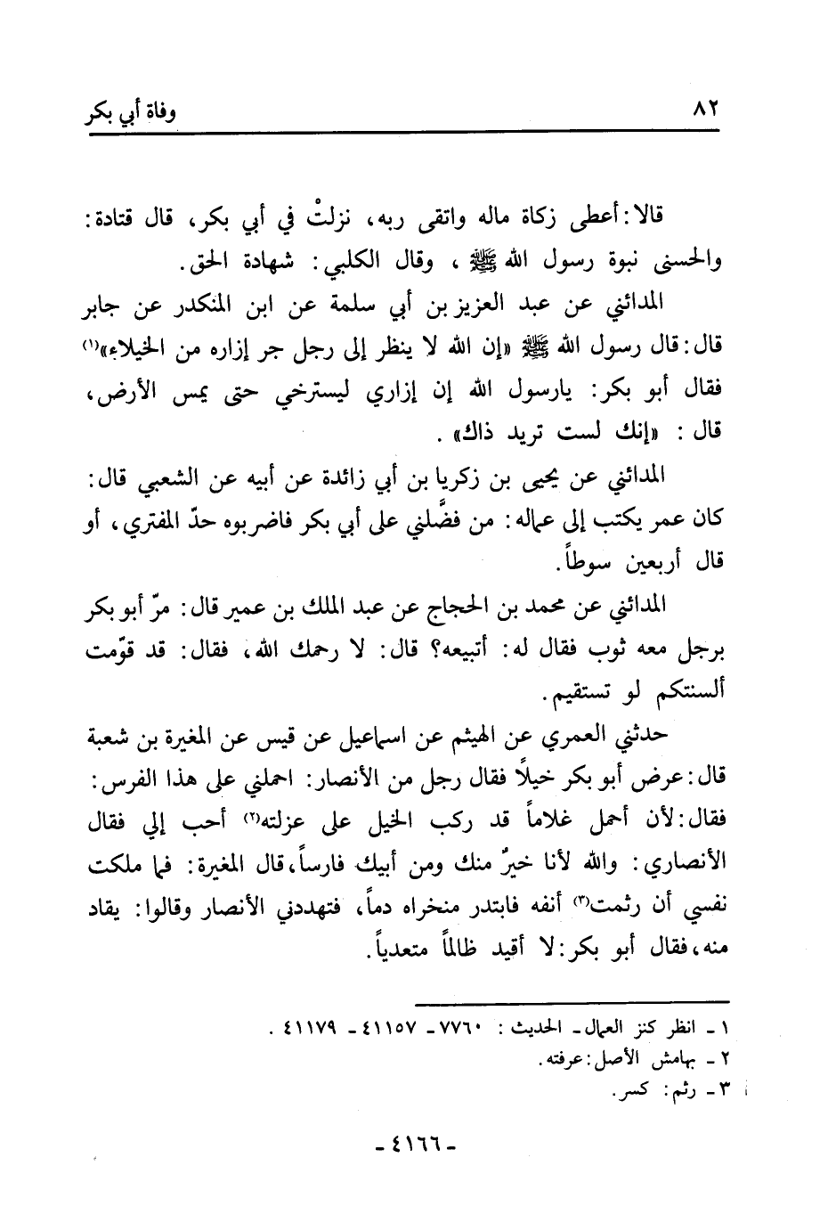 الْمَدَائِنِيُّ عَنْ عَبْدِ الْعَزِيزِ بْنِ أَبِي سَلَمَةَ عَنِ ابْنِ الْمُنْكَدِرِ عَنْ جَابِرٍ قَالَ: [قَالَ رَسُولُ اللَّهِ صَلَّى اللَّهُ عَلَيْهِ وَسَلَّمَ «إِنَّ اللَّهَ لا يَنْظُرُ إِلَى رَجُلٍ جَرَّ إِزَارَهُ مِنَ الْخُيَلاءِ] [1] فَقَالَ أَبُو بَكْرٍ: يَا رَسُولَ اللَّهِ إِنَّ إِزَارِي لَيَسْتَرْخِي حَتَّى يَمَسَّ الأَرْضَ، قَالَ: [ «إِنَّكَ لَسْتَ تُرِيدُ ذَاكَ» ] .