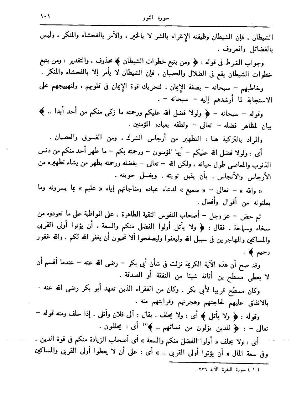ثم حض- عز وجل- أصحاب النفوس النقية الطاهرة، على المواظبة على ما تعودوه من سخاء وسماحة، فقال: وَلا يَأْتَلِ أُولُوا الْفَضْلِ مِنْكُمْ وَالسَّعَةِ، أَنْ يُؤْتُوا أُولِي الْقُرْبى وَالْمَساكِينَ وَالْمُهاجِرِينَ فِي سَبِيلِ اللَّهِ وَلْيَعْفُوا وَلْيَصْفَحُوا أَلا تُحِبُّونَ أَنْ يَغْفِرَ اللَّهُ لَكُمْ. وَاللَّهُ غَفُورٌ رَحِيمٌ.