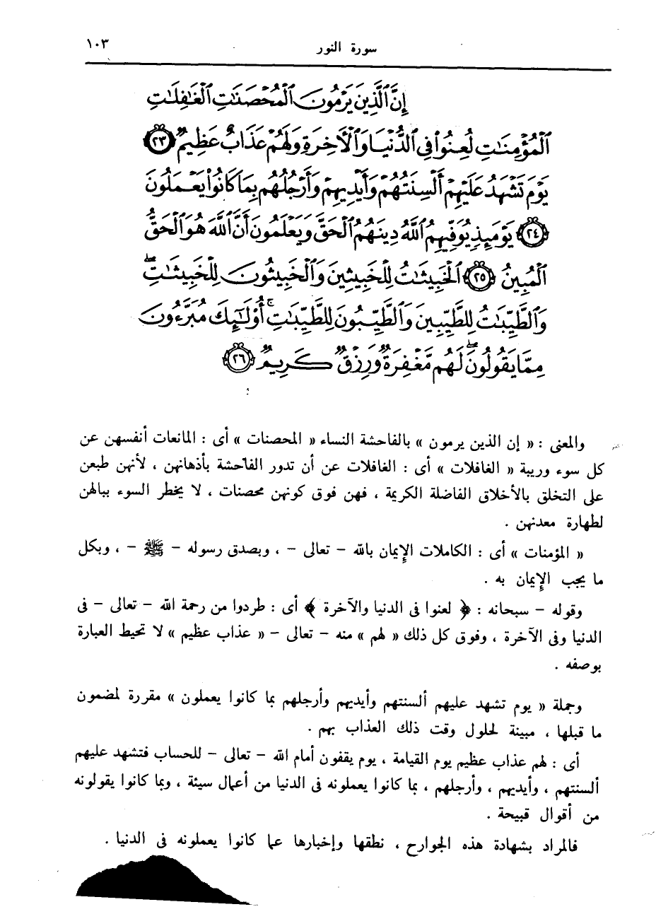 إِنَّ الَّذِينَ يَرْمُونَ الْمُحْصَناتِ الْغافِلاتِ الْمُؤْمِناتِ لُعِنُوا فِي الدُّنْيا وَالْآخِرَةِ وَلَهُمْ عَذابٌ عَظِيمٌ (23) يَوْمَ تَشْهَدُ عَلَيْهِمْ أَلْسِنَتُهُمْ وَأَيْدِيهِمْ وَأَرْجُلُهُمْ بِما كانُوا يَعْمَلُونَ (24) يَوْمَئِذٍ يُوَفِّيهِمُ اللَّهُ دِينَهُمُ الْحَقَّ وَيَعْلَمُونَ أَنَّ اللَّهَ هُوَ الْحَقُّ الْمُبِينُ (25) الْخَبِيثاتُ لِلْخَبِيثِينَ وَالْخَبِيثُونَ لِلْخَبِيثاتِ وَالطَّيِّباتُ لِلطَّيِّبِينَ وَالطَّيِّبُونَ لِلطَّيِّباتِ أُولئِكَ مُبَرَّؤُنَ مِمَّا يَقُولُونَ لَهُمْ مَغْفِرَةٌ وَرِزْقٌ كَرِيمٌ (26)