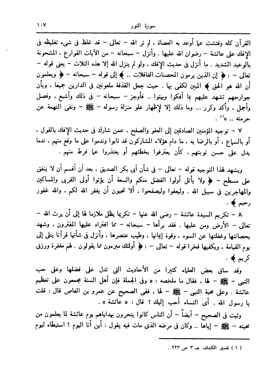 8- تكريم السيدة عائشة- رضى الله عنها- تكريما يظل ملازما لها إلى أن يرث الله- تعالى- الأرض ومن عليها. فقد برأها- سبحانه- مما افتراه عليها المفترون، وشهد بحصانتها وغفلتها عن السوء، وقوة إيمانها، وطيب عنصرها، وأنزل في شأنها قرآنا يتلى إلى يوم القيامة، ويكفيها فخرا قوله- تعالى-: أُولئِكَ مُبَرَّؤُنَ مِمَّا يَقُولُونَ. لَهُمْ مَغْفِرَةٌ وَرِزْقٌ كَرِيمٌ.