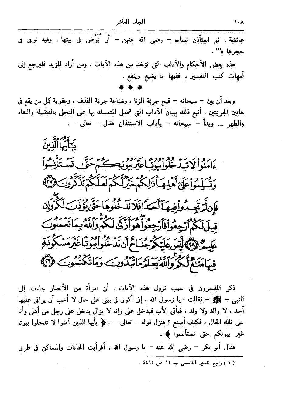 يا أَيُّهَا الَّذِينَ آمَنُوا لا تَدْخُلُوا بُيُوتاً غَيْرَ بُيُوتِكُمْ حَتَّى تَسْتَأْنِسُوا وَتُسَلِّمُوا عَلى أَهْلِها ذلِكُمْ خَيْرٌ لَكُمْ لَعَلَّكُمْ تَذَكَّرُونَ (27) فَإِنْ لَمْ تَجِدُوا فِيها أَحَداً فَلا تَدْخُلُوها حَتَّى يُؤْذَنَ لَكُمْ وَإِنْ قِيلَ لَكُمُ ارْجِعُوا فَارْجِعُوا هُوَ أَزْكى لَكُمْ وَاللَّهُ بِما تَعْمَلُونَ عَلِيمٌ (28) لَيْسَ عَلَيْكُمْ جُناحٌ أَنْ تَدْخُلُوا بُيُوتاً غَيْرَ مَسْكُونَةٍ فِيها مَتاعٌ لَكُمْ وَاللَّهُ يَعْلَمُ ما تُبْدُونَ وَما تَكْتُمُونَ (29)