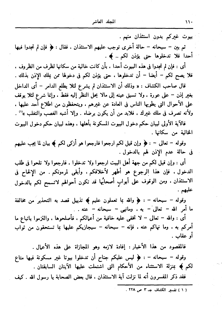 قال صاحب الكشاف: «وذلك أن الاستئذان لم يشرع لئلا يطلع الدامر- أى الداخل بغير إذن- على عورة، ولا تسبق عينه إلى ما لا يحل النظر إليه فقط، وإنما شرع لئلا يوقف على الأحوال التي يطويها الناس في العادة عن غيرهم، ويتحفظون من اطلاع أحد عليها، ولأنه تصرف في ملك غيرك، فلا بد من أن يكون برضاه. وإلا أشبه الغصب والتغلب» «1» .