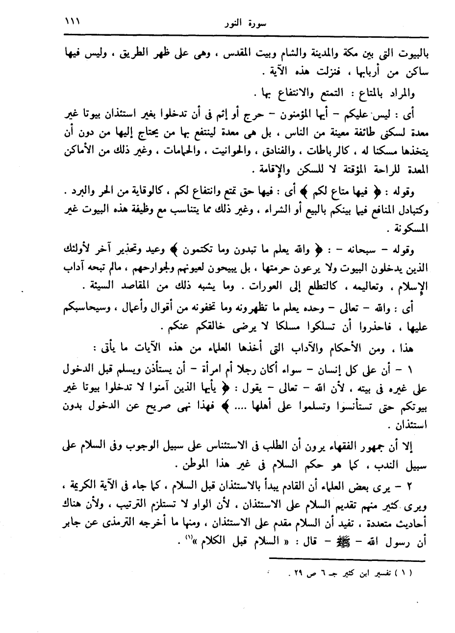 2- يرى بعض العلماء أن القادم يبدأ بالاستئذان قبل السلام، كما جاء في الآية الكريمة، ويرى كثير منهم تقديم السلام على الاستئذان، لأن الواو لا تستلزم الترتيب، ولأن هناك أحاديث متعددة، تفيد أن السلام مقدم على الاستئذان، ومنها ما أخرجه الترمذي عن جابر أن رسول الله صلّى الله عليه وسلّم قال: «السلام قبل الكلام» «1» .