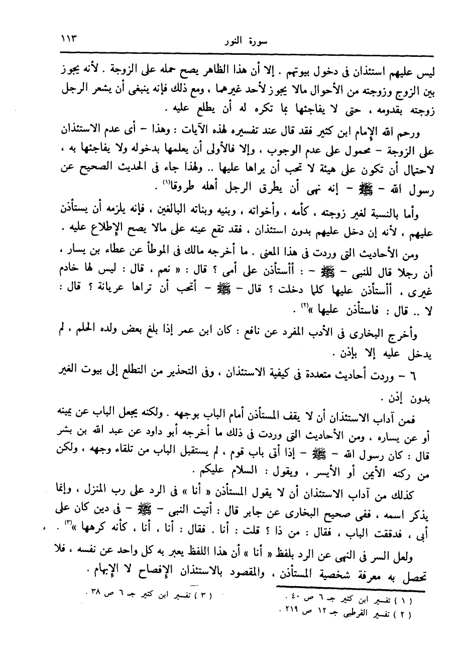 ورحم الله الإمام ابن كثير فقد قال عند تفسيره لهذه الآيات: وهذا- أى عدم الاستئذان على الزوجة- محمول على عدم الوجوب، وإلا فالأولى أن يعلمها بدخوله ولا يفاجئها به، لاحتمال أن تكون على هيئة لا تحب أن يراها عليها.. ولهذا جاء في الحديث الصحيح عن رسول الله صلّى الله عليه وسلّم إنه نهى أن يطرق الرجل أهله طروقا «1» .