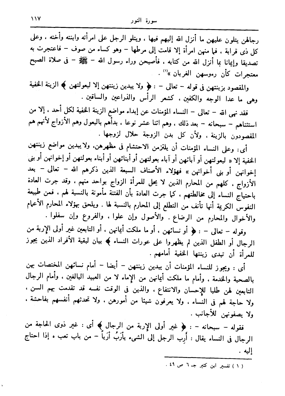 رجالهن يتلون عليهن ما أنزل الله إليهم فيها، ويتلو الرجل على امرأته وابنته وأخته، وعلى كل ذي قرابة، فما منهن امرأة إلا قامت إلى مرطها- وهو كساء من صوف- فاعتجرت به تصديقا وإيمانا بما أنزل الله من كتابه، فأصبحن وراء رسول الله صلّى الله عليه وسلّم في صلاة الصبح معتجرات كأن رءوسهن الغربان» «1» .