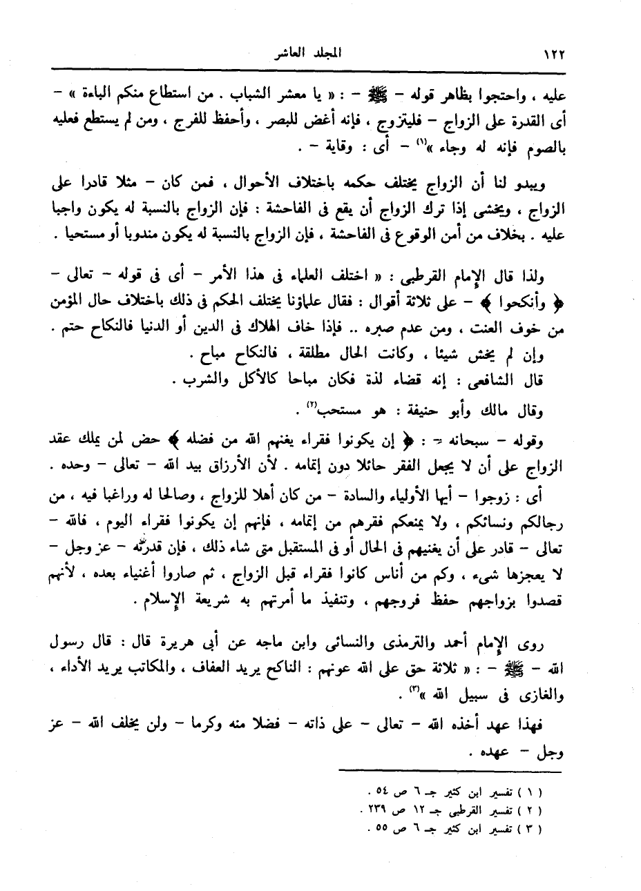 ولذا قال الإمام القرطبي: «اختلف العلماء في هذا الأمر- أى في قوله- تعالى- وَأَنْكِحُوا- على ثلاثة أقوال: فقال علماؤنا يختلف الحكم في ذلك باختلاف حال المؤمن من خوف العنت، ومن عدم صبره.. فإذا خاف الهلاك في الدين أو الدنيا فالنكاح حتم.