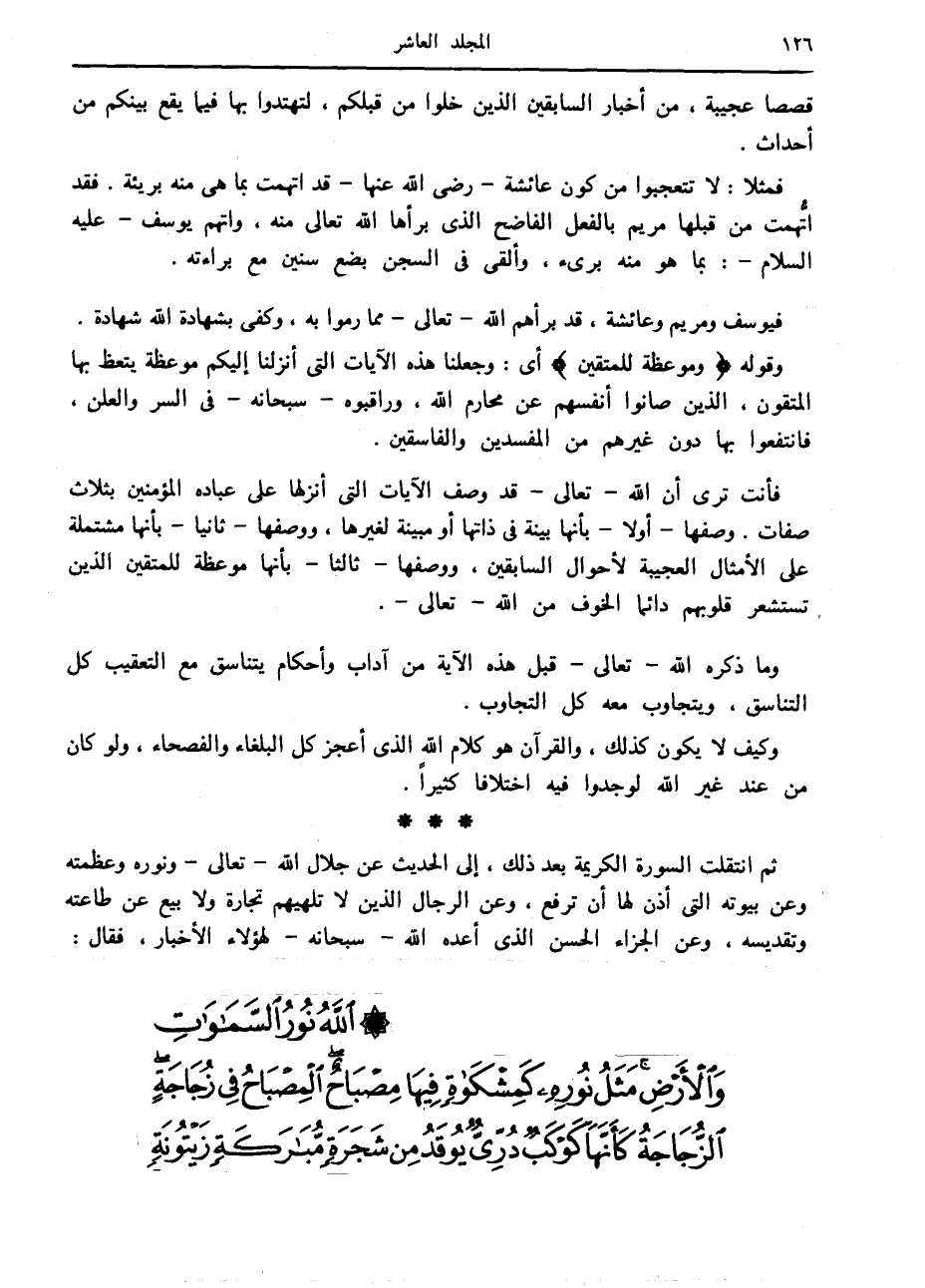 ثم انتقلت السورة الكريمة بعد ذلك، إلى الحديث عن جلال الله- تعالى- ونوره وعظمته وعن بيوته التي أذن لها أن ترفع، وعن الرجال الذين لا تلهيهم تجارة ولا بيع عن طاعته وتقديسه، وعن الجزاء الحسن الذي أعده الله- سبحانه- لهؤلاء الأخيار، فقال:
