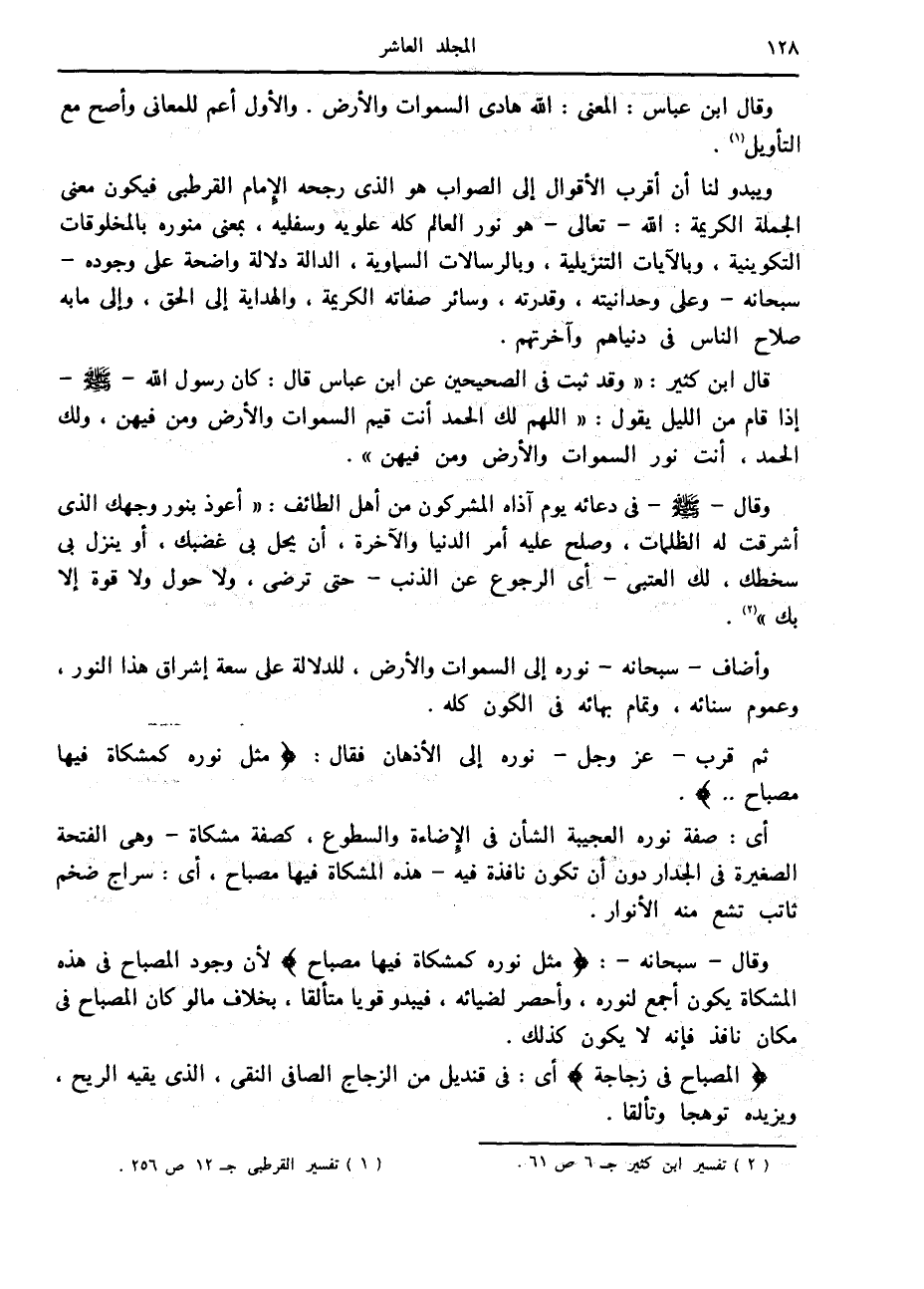 ويبدو لنا أن أقرب الأقوال إلى الصواب هو الذي رجحه الإمام القرطبي فيكون معنى الجملة الكريمة: الله- تعالى- هو نور العالم كله علويه وسفليه، بمعنى منوره بالمخلوقات التكوينية، وبالآيات التنزيلية، وبالرسالات السماوية، الدالة دلالة واضحة على وجوده- سبحانه- وعلى وحدانيته، وقدرته، وسائر صفاته الكريمة، والهادية إلى الحق، وإلى ما به صلاح الناس في دنياهم وآخرتهم.