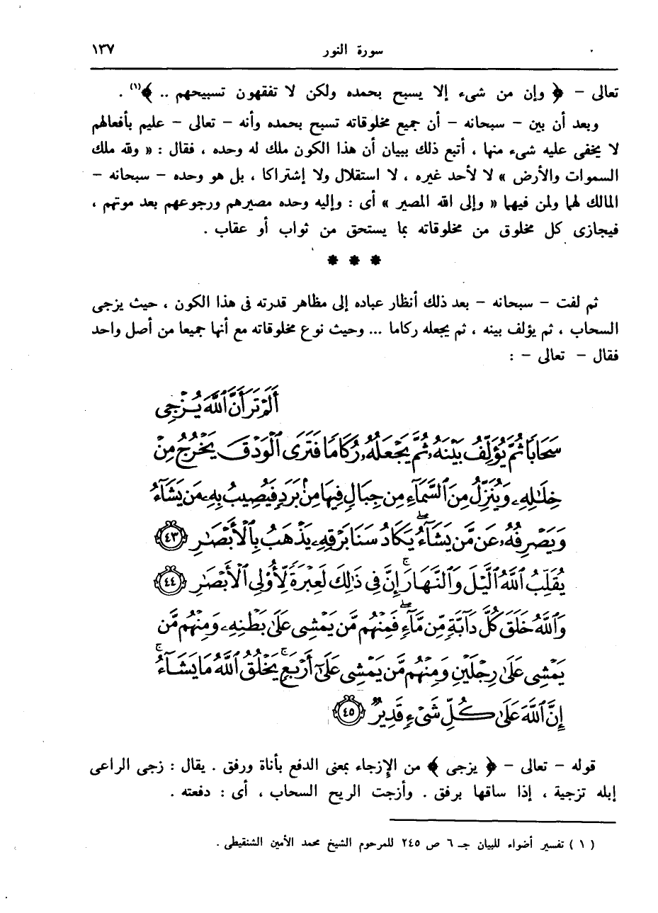 ثم لفت- سبحانه- بعد ذلك أنظار عباده إلى مظاهر قدرته في هذا الكون، حيث يزجى السحاب، ثم يؤلف بينه، ثم يجعله ركاما ... وحيث نوع مخلوقاته مع أنها جميعا من أصل واحد فقال- تعالى-: