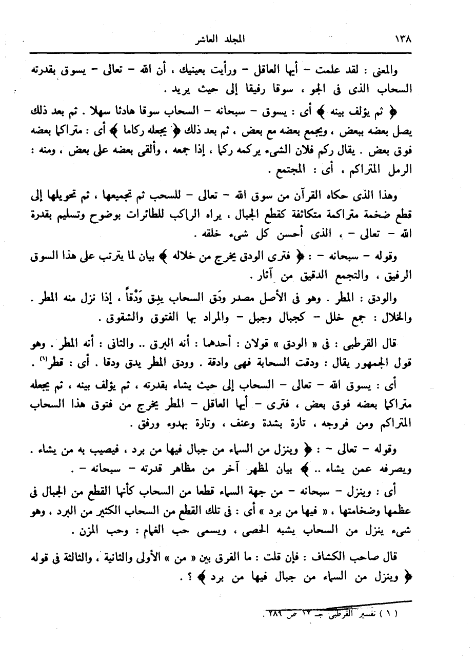 وهذا الذي حكاه القرآن من سوق الله- تعالى- للسحب ثم تجميعها، ثم تحويلها إلى قطع ضخمة متراكمة متكاثفة كقطع الجبال، يراه الراكب للطائرات بوضوح وتسليم بقدرة الله- تعالى-، الذي أحسن كل شيء خلقه.