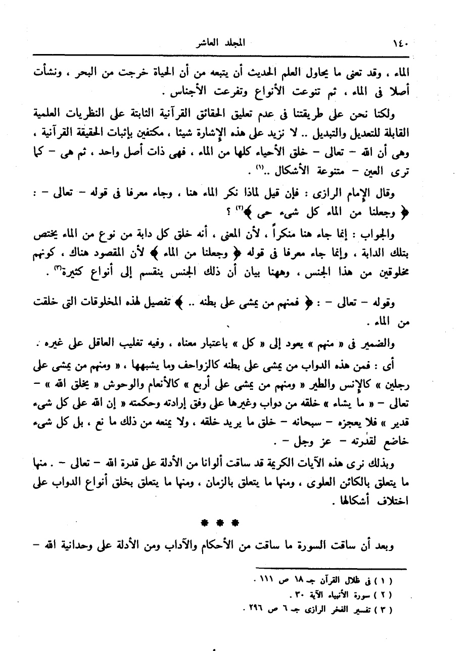 ولكنا نحن على طريقتنا في عدم تعليق الحقائق القرآنية الثابتة على النظريات العلمية القابلة للتعديل والتبديل.. لا نزيد على هذه الإشارة شيئا، مكتفين بإثبات الحقيقة القرآنية، وهي أن الله- تعالى- خلق الأحياء كلها من الماء، فهي ذات أصل واحد، ثم هي- كما ترى العين- متنوعة الأشكال.. «1» .