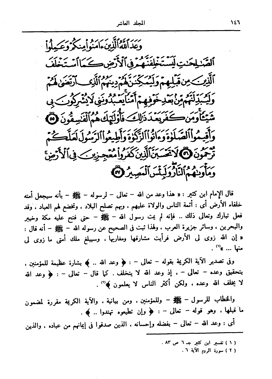 وَعَدَ اللَّهُ الَّذِينَ آمَنُوا مِنْكُمْ وَعَمِلُوا الصَّالِحاتِ لَيَسْتَخْلِفَنَّهُمْ فِي الْأَرْضِ كَمَا اسْتَخْلَفَ الَّذِينَ مِنْ قَبْلِهِمْ وَلَيُمَكِّنَنَّ لَهُمْ دِينَهُمُ الَّذِي ارْتَضى لَهُمْ وَلَيُبَدِّلَنَّهُمْ مِنْ بَعْدِ خَوْفِهِمْ أَمْناً يَعْبُدُونَنِي لا يُشْرِكُونَ بِي شَيْئاً وَمَنْ كَفَرَ بَعْدَ ذلِكَ فَأُولئِكَ هُمُ الْفاسِقُونَ (55) وَأَقِيمُوا الصَّلاةَ وَآتُوا الزَّكاةَ وَأَطِيعُوا الرَّسُولَ لَعَلَّكُمْ تُرْحَمُونَ (56) لا تَحْسَبَنَّ الَّذِينَ كَفَرُوا مُعْجِزِينَ فِي الْأَرْضِ وَمَأْواهُمُ النَّارُ وَلَبِئْسَ الْمَصِيرُ (57)