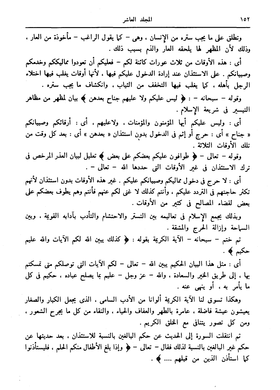 ثم انتقلت السورة إلى الحديث عن حكم البالغين بالنسبة للاستئذان، بعد حديثها عن حكم غير البالغين بالنسبة لذلك فقال- تعالى- وَإِذا بَلَغَ الْأَطْفالُ مِنْكُمُ الْحُلُمَ، فَلْيَسْتَأْذِنُوا كَمَا اسْتَأْذَنَ الَّذِينَ مِنْ قَبْلِهِمْ....