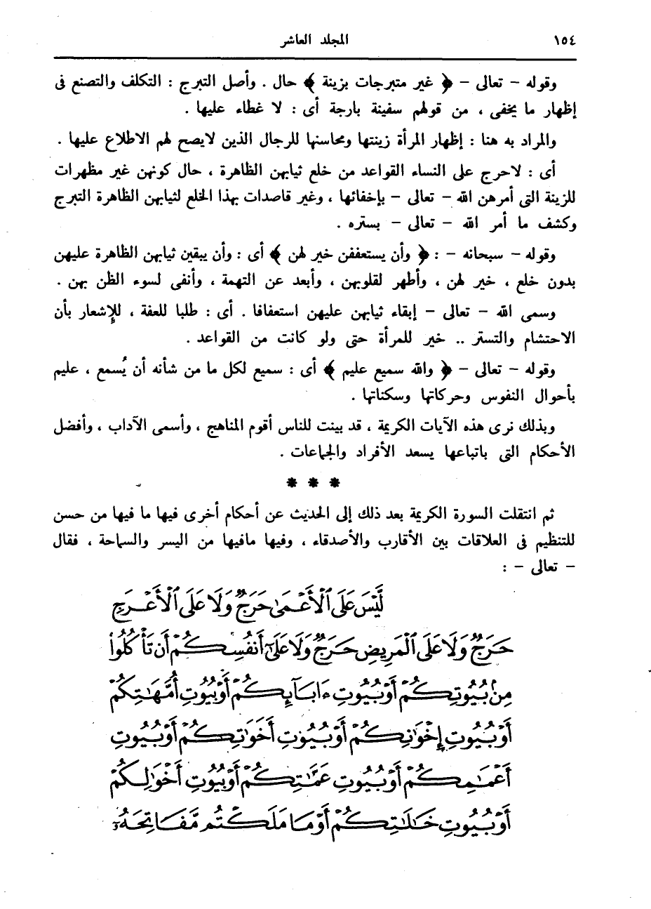 أى: لا حرج على النساء القواعد من خلع ثيابهن الظاهرة، حال كونهن غير مظهرات للزينة التي أمرهن الله- تعالى- بإخفائها، وغير قاصدات بهذا الخلع لثيابهن الظاهرة التبرج وكشف ما أمر الله- تعالى- بستره.