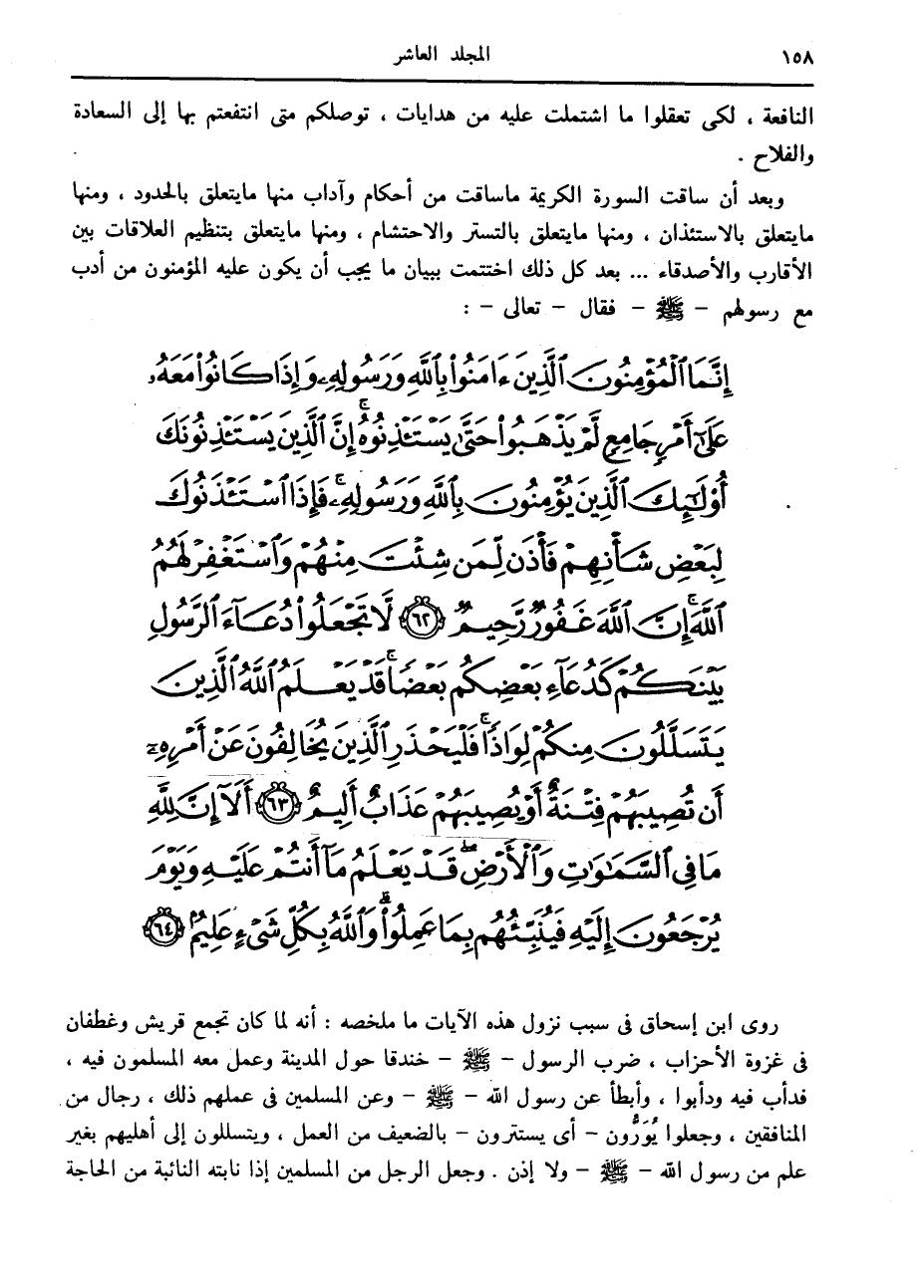 إِنَّمَا الْمُؤْمِنُونَ الَّذِينَ آمَنُوا بِاللَّهِ وَرَسُولِهِ وَإِذا كانُوا مَعَهُ عَلى أَمْرٍ جامِعٍ لَمْ يَذْهَبُوا حَتَّى يَسْتَأْذِنُوهُ إِنَّ الَّذِينَ يَسْتَأْذِنُونَكَ أُولئِكَ الَّذِينَ يُؤْمِنُونَ بِاللَّهِ وَرَسُولِهِ فَإِذَا اسْتَأْذَنُوكَ لِبَعْضِ شَأْنِهِمْ فَأْذَنْ لِمَنْ شِئْتَ مِنْهُمْ وَاسْتَغْفِرْ لَهُمُ اللَّهَ إِنَّ اللَّهَ غَفُورٌ رَحِيمٌ (62) لا تَجْعَلُوا دُعاءَ الرَّسُولِ بَيْنَكُمْ كَدُعاءِ بَعْضِكُمْ بَعْضاً قَدْ يَعْلَمُ اللَّهُ الَّذِينَ يَتَسَلَّلُونَ مِنْكُمْ لِواذاً فَلْيَحْذَرِ الَّذِينَ يُخالِفُونَ عَنْ أَمْرِهِ أَنْ تُصِيبَهُمْ فِتْنَةٌ أَوْ يُصِيبَهُمْ عَذابٌ أَلِيمٌ (63) أَلا إِنَّ لِلَّهِ ما فِي السَّماواتِ وَالْأَرْضِ قَدْ يَعْلَمُ ما أَنْتُمْ عَلَيْهِ وَيَوْمَ يُرْجَعُونَ إِلَيْهِ فَيُنَبِّئُهُمْ بِما عَمِلُوا وَاللَّهُ بِكُلِّ شَيْءٍ عَلِيمٌ (64)