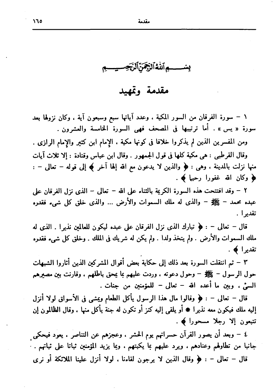 2- وقد افتتحت هذه السورة الكريمة بالثناء على الله- تعالى- الذي نزل الفرقان على عبده محمد صلّى الله عليه وسلّم والذي له ملك السموات والأرض ... والذي خلق كل شيء فقدره تقديرا.