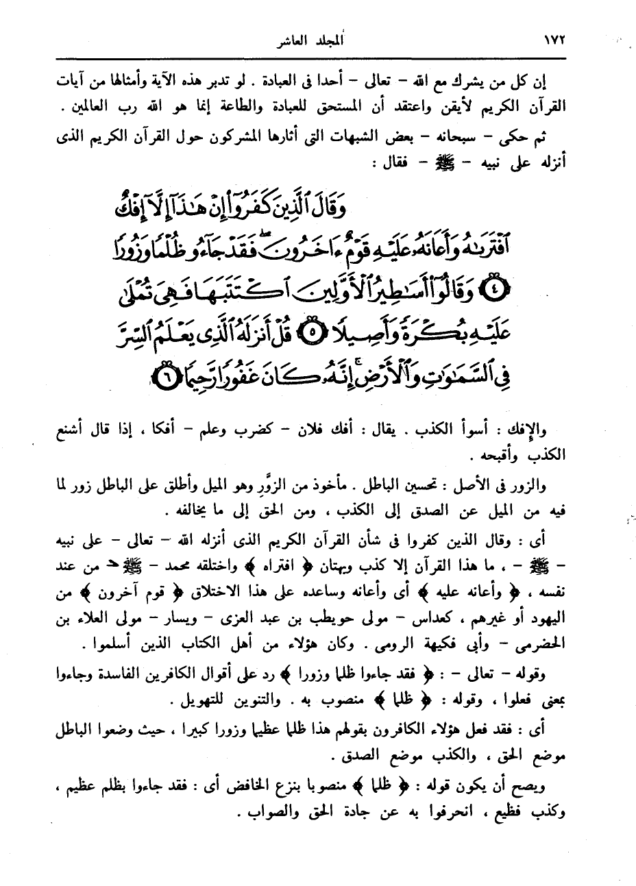 وَقالَ الَّذِينَ كَفَرُوا إِنْ هَذا إِلاَّ إِفْكٌ افْتَراهُ وَأَعانَهُ عَلَيْهِ قَوْمٌ آخَرُونَ فَقَدْ جاؤُ ظُلْماً وَزُوراً (4) وَقالُوا أَساطِيرُ الْأَوَّلِينَ اكْتَتَبَها فَهِيَ تُمْلى عَلَيْهِ بُكْرَةً وَأَصِيلاً (5) قُلْ أَنْزَلَهُ الَّذِي يَعْلَمُ السِّرَّ فِي السَّماواتِ وَالْأَرْضِ إِنَّهُ كانَ غَفُوراً رَحِيماً (6)