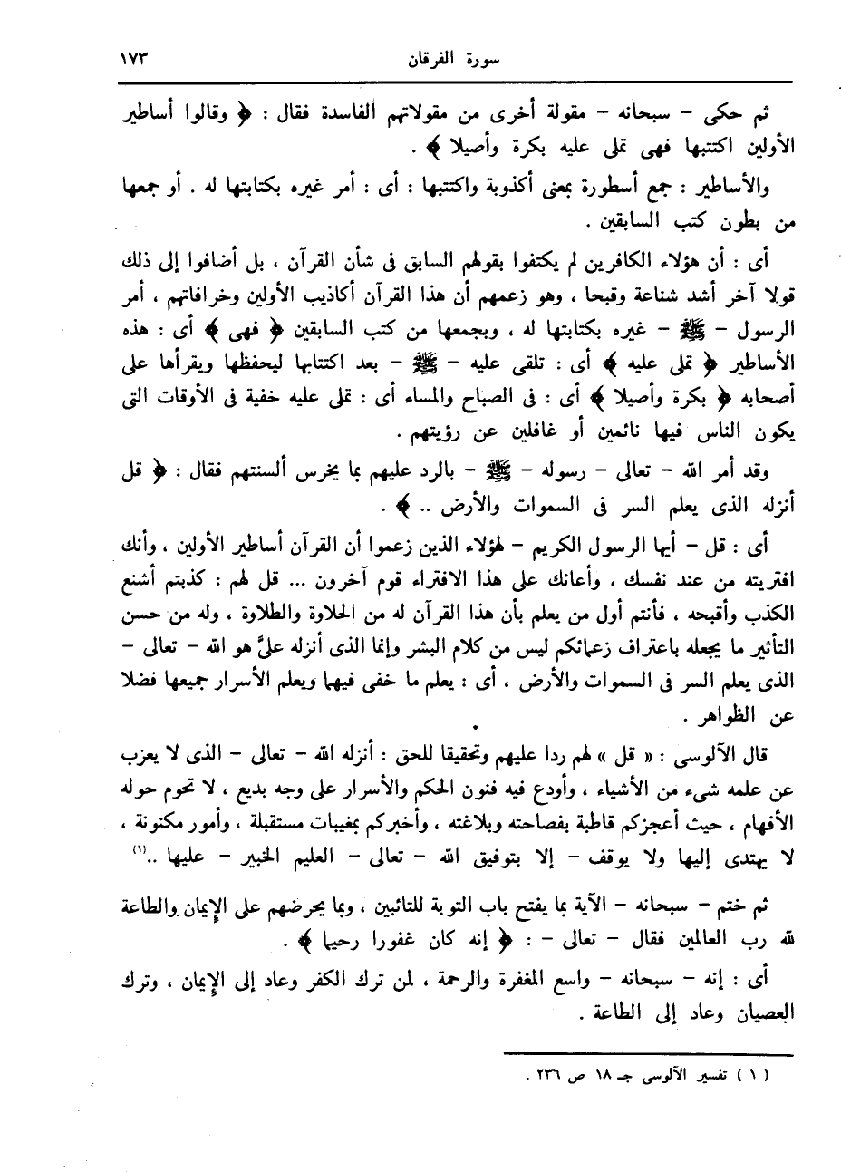 قال الآلوسى: «قل» لهم ردا عليهم وتحقيقا للحق: أنزله الله- تعالى- الذي لا يعزب عن علمه شيء من الأشياء، وأودع فيه فنون الحكم والأسرار على وجه بديع، لا تحوم حوله الأفهام، حيث أعجزكم قاطبة بفصاحته وبلاغته، وأخبركم بمغيبات مستقبلة، وأمور مكنونة، لا يهتدى إليها ولا يوقف- إلا بتوفيق الله- تعالى- العليم الخبير- عليها.. «1»