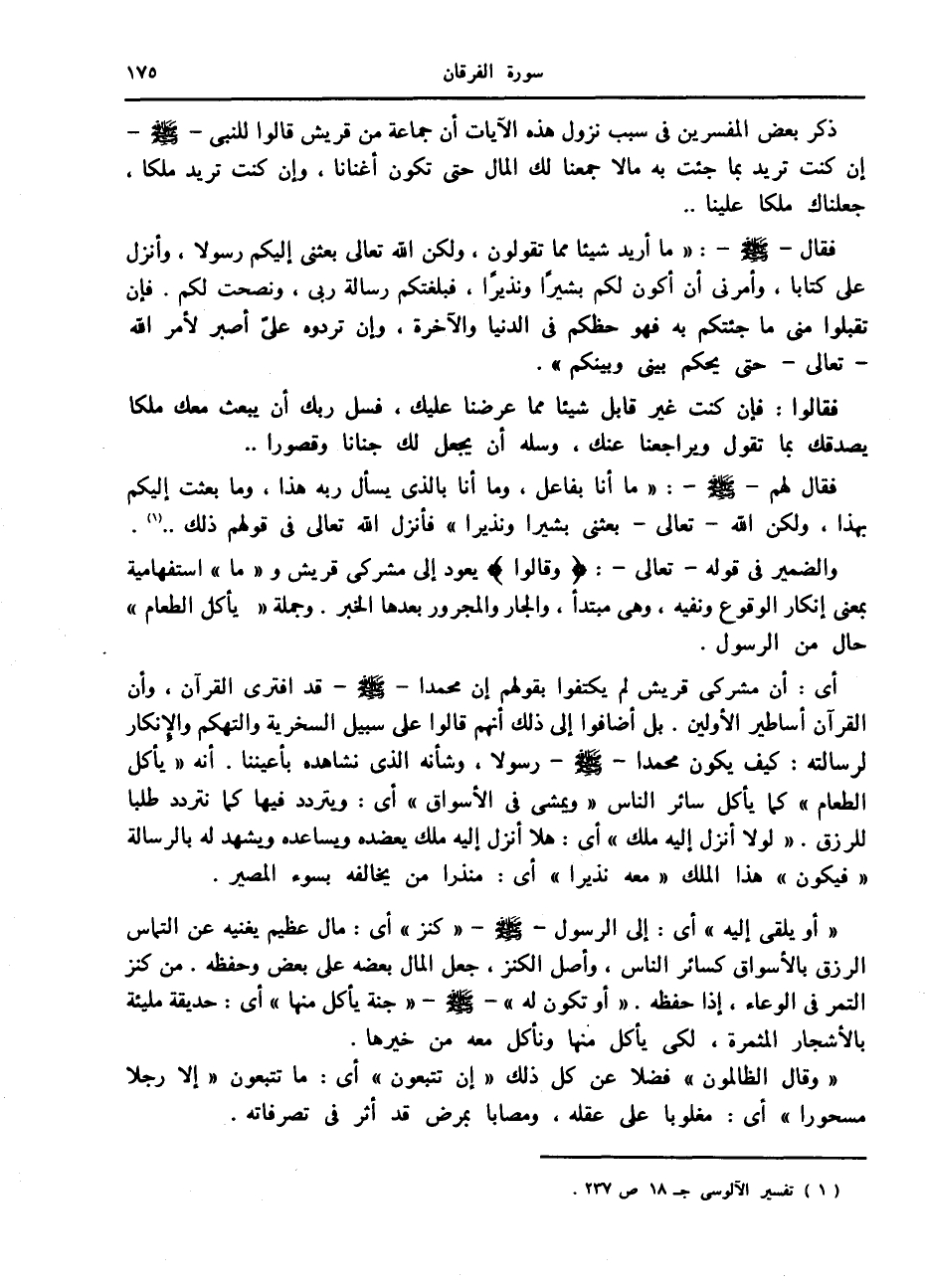 أى: أن مشركي قريش لم يكتفوا بقولهم إن محمد صلّى الله عليه وسلّم قد افترى القرآن، وإن القرآن أساطير الأولين. بل أضافوا إلى ذلك أنهم قالوا على سبيل السخرية والتهكم والإنكار لرسالته: كيف يكون محمدا صلّى الله عليه وسلّم رسولا، وشأنه الذين نشاهده بأعيننا. أنه «يأكل الطعام» كما يأكل سائر الناس «ويمشى في الأسواق» أى: ويتردد فيها كما نتردد طلبا للرزق. «لولا أنزل إليه ملك» أى: هلا أنزل إليه ملك يعضده ويساعده ويشهد له بالرسالة «فيكون» هذا الملك «معه نذيرا» أى: منذرا من يخالفه بسوء المصير.