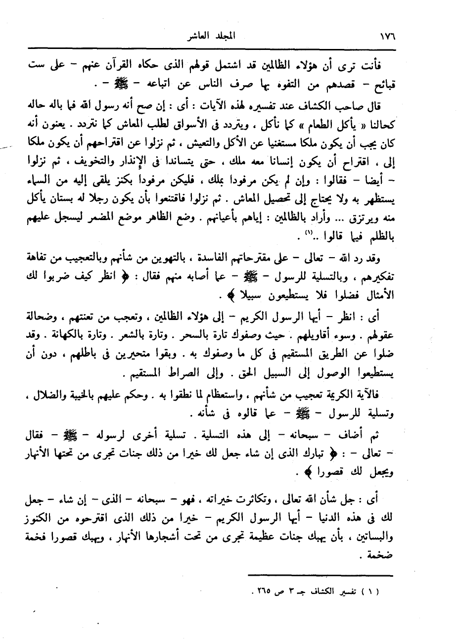 قال صاحب الكشاف عند تفسيره لهذه الآيات: أى: إن صح أنه رسول الله فما باله حاله كحالنا «يأكل الطعام» كما نأكل، ويتردد في الأسواق لطلب المعاش كما نتردد. يعنون أنه كان يجب أن يكون ملكا مستغنيا عن الأكل والتعيش، ثم نزلوا عن اقتراحهم أن يكون ملكا إلى، اقتراح أن يكون إنسانا معه ملك، حتى يتساندا في الإنذار والتخويف، ثم نزلوا- أيضا- فقالوا: وإن لم يكن مرفودا بملك، فليكن مرفودا بكنز يلقى إليه من السماء يستظهر به ولا يحتاج إلى تحصيل المعاش. ثم نزلوا فاقتنعوا بأن يكون رجلا له بستان يأكل منه ويرتزق ... وأراد بالظالمين: إياهم بأعيانهم. وضع الظاهر موضع المضمر ليسجل عليهم بالظلم فيما قالوا.. «1» .