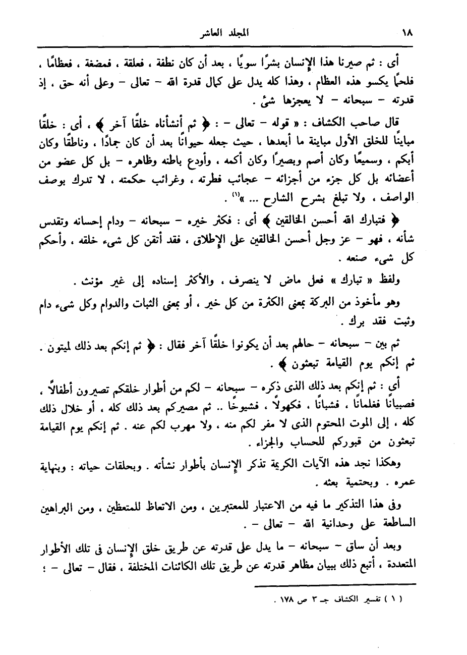 قال صاحب الكشاف: «قوله- تعالى-: ثُمَّ أَنْشَأْناهُ خَلْقاً آخَرَ، أى: خلقا مباينا للخلق الأول مباينة ما أبعدها، حيث جعله حيوانا بعد أن كان جمادا، وناطقا وكان أبكم، وسميعا وكان أصم وبصيرا وكان أكمه، وأودع باطنه وظاهره- بل كل عضو من أعضائه بل كل جزء من أجزائه- عجائب فطرته، وغرائب حكمته، لا تدرك بوصف الواصف، ولا تبلغ بشرح الشارح ... » «1» .