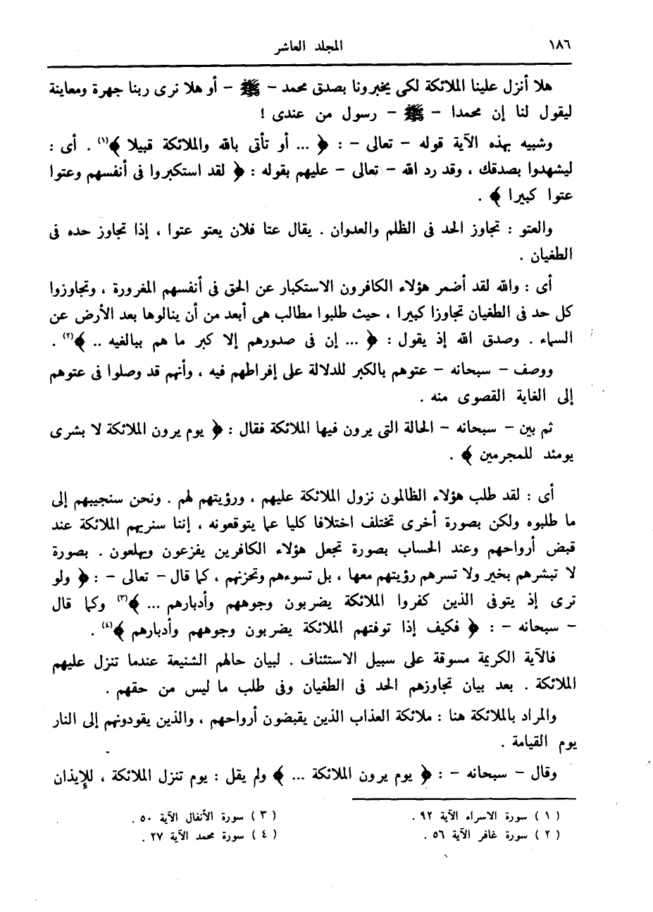 هلا أنزل علينا الملائكة لكي يخبرونا بصدق محمد صلّى الله عليه وسلّم أو هلا نرى ربنا جهرة ومعاينة ليقول لنا إن محمدا صلّى الله عليه وسلّم رسول من عندي! وشبيه بهذه الآية قوله- تعالى-: ... أَوْ تَأْتِيَ بِاللَّهِ وَالْمَلائِكَةِ قَبِيلًا «1» . أى: