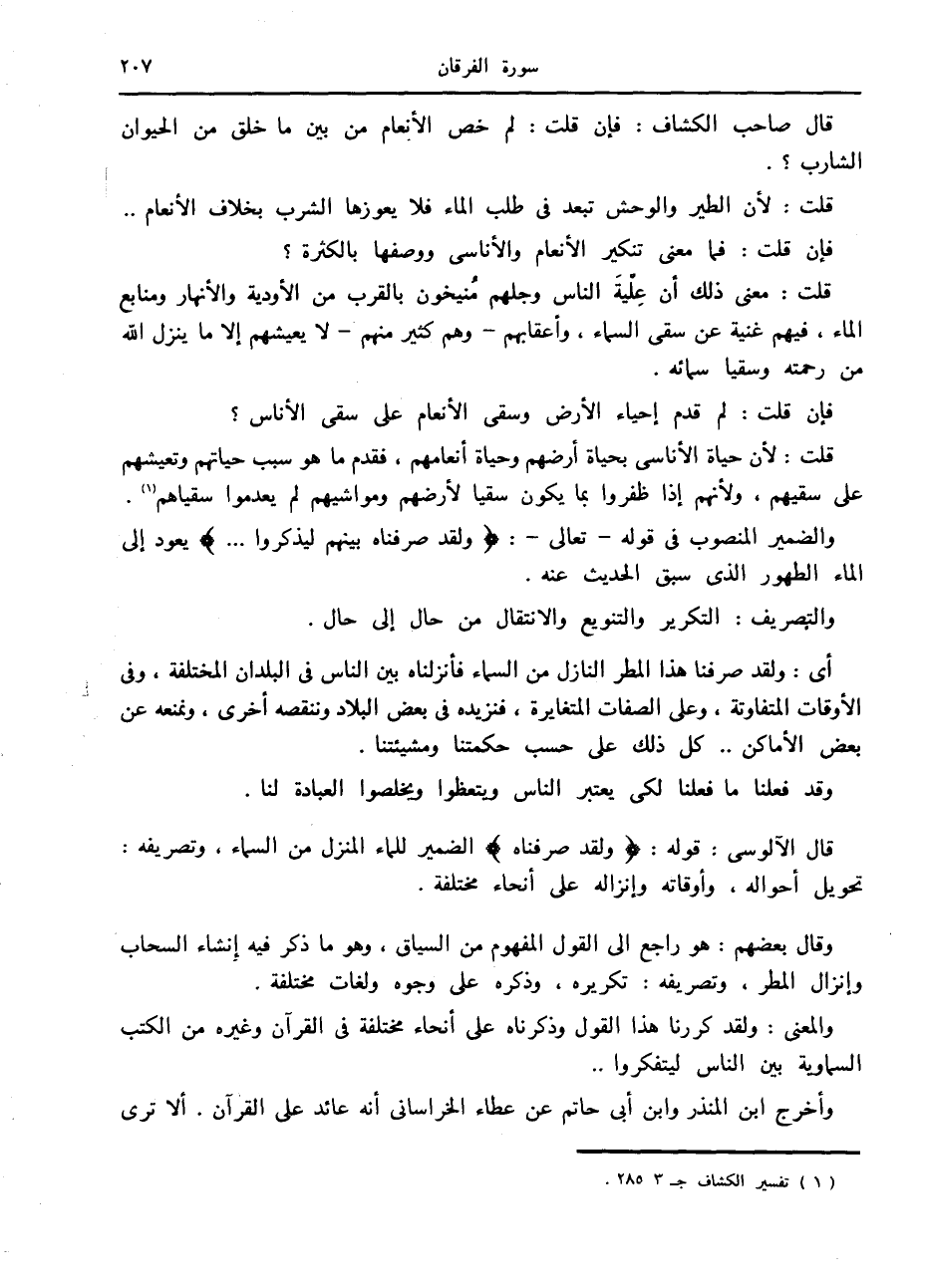 والضمير المنصوب في قوله- تعالى-: وَلَقَدْ صَرَّفْناهُ بَيْنَهُمْ لِيَذَّكَّرُوا ... يعود إلى الماء الطهور الذي سبق الحديث عنه.