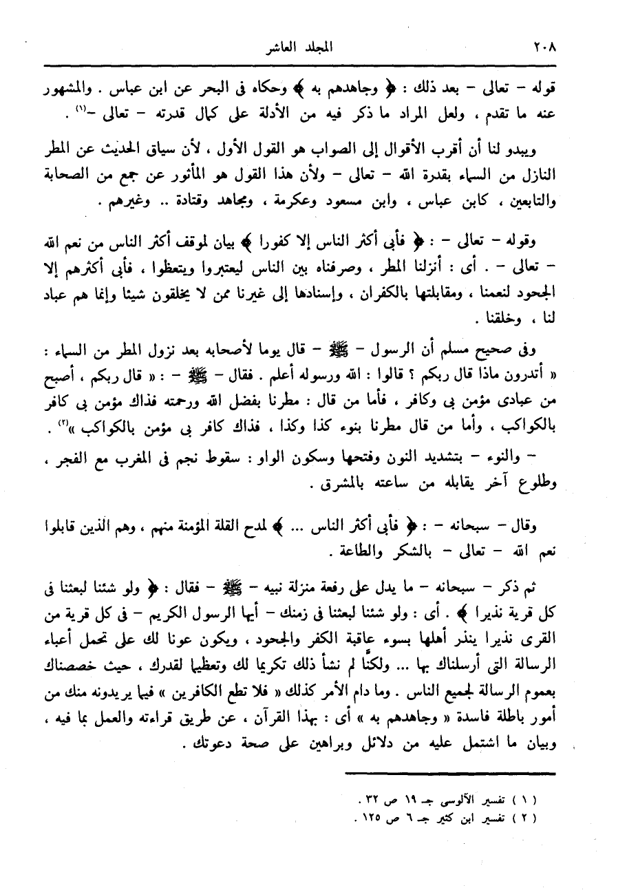 قوله- تعالى- بعد ذلك: وَجاهِدْهُمْ بِهِ وحكاه في البحر عن ابن عباس. والمشهور عنه ما تقدم، ولعل المراد ما ذكر فيه من الأدلة على كمال قدرته- تعالى- «1» .