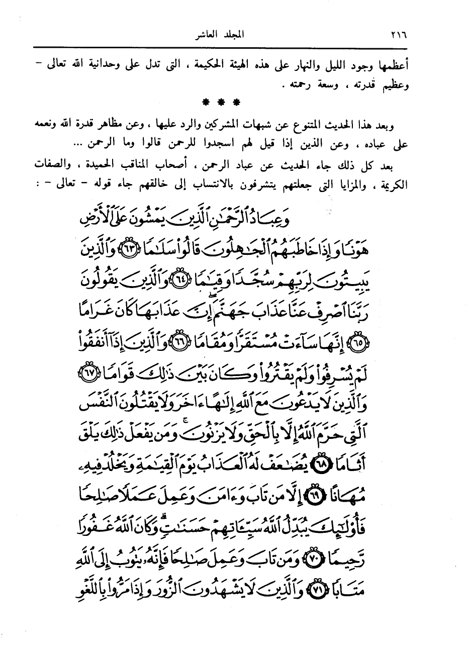 وَعِبادُ الرَّحْمنِ الَّذِينَ يَمْشُونَ عَلَى الْأَرْضِ هَوْناً وَإِذا خاطَبَهُمُ الْجاهِلُونَ قالُوا سَلاماً (63) وَالَّذِينَ يَبِيتُونَ لِرَبِّهِمْ سُجَّداً وَقِياماً (64) وَالَّذِينَ يَقُولُونَ رَبَّنَا اصْرِفْ عَنَّا عَذابَ جَهَنَّمَ إِنَّ عَذابَها كانَ غَراماً (65) إِنَّها ساءَتْ مُسْتَقَرًّا وَمُقاماً (66) وَالَّذِينَ إِذا أَنْفَقُوا لَمْ يُسْرِفُوا وَلَمْ يَقْتُرُوا وَكانَ بَيْنَ ذلِكَ قَواماً (67)