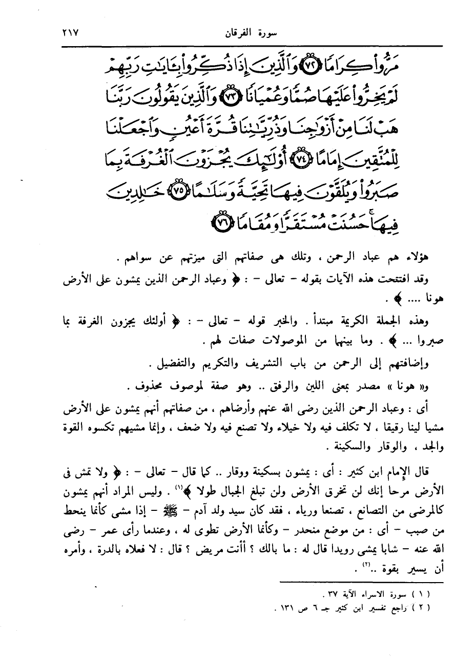 وقد افتتحت هذه الآيات بقوله- تعالى-: وَعِبادُ الرَّحْمنِ الَّذِينَ يَمْشُونَ عَلَى الْأَرْضِ هَوْناً....