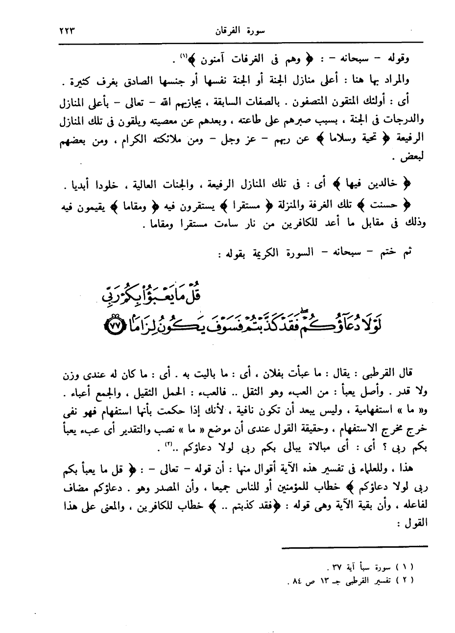 قُلْ ما يَعْبَؤُا بِكُمْ رَبِّي لَوْلا دُعاؤُكُمْ فَقَدْ كَذَّبْتُمْ فَسَوْفَ يَكُونُ لِزاماً (77)
