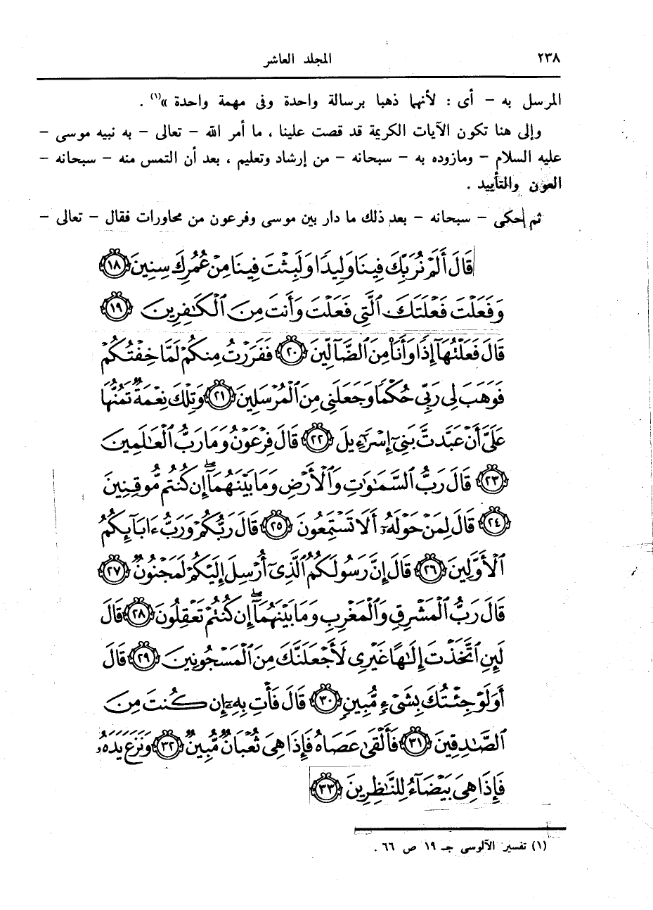 قالَ رَبُّ الْمَشْرِقِ وَالْمَغْرِبِ وَما بَيْنَهُما إِنْ كُنْتُمْ تَعْقِلُونَ (28) قالَ لَئِنِ اتَّخَذْتَ إِلهَاً غَيْرِي لَأَجْعَلَنَّكَ مِنَ الْمَسْجُونِينَ (29) قالَ أَوَلَوْ جِئْتُكَ بِشَيْءٍ مُبِينٍ (30) قالَ فَأْتِ بِهِ إِنْ كُنْتَ مِنَ الصَّادِقِينَ (31) فَأَلْقى عَصاهُ فَإِذا هِيَ ثُعْبانٌ مُبِينٌ (32)