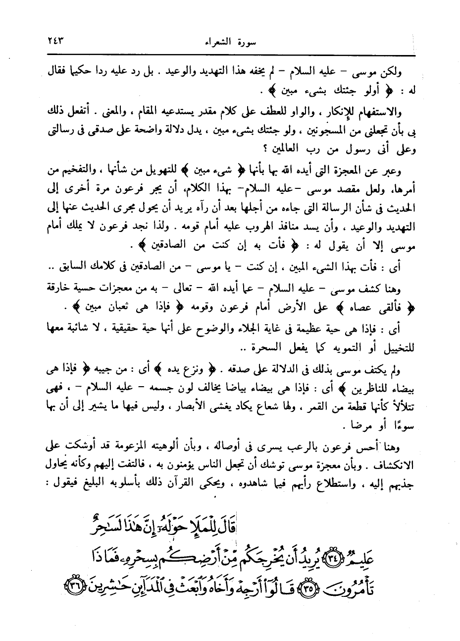 وهنا أحس فرعون بالرعب يسرى في أوصاله، وبأن ألوهيته المزعومة قد أوشكت على الانكشاف. وبأن معجزة موسى توشك أن تجعل الناس يؤمنون به، فالتفت إليهم وكأنه يحاول جذبهم إليه، واستطلاع رأيهم فيما شاهدوه، ويحكى القرآن ذلك بأسلوبه البليغ فيقول:
