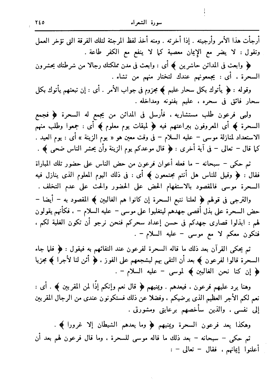 والترجي في قولهم لَعَلَّنا نَتَّبِعُ السَّحَرَةَ إِنْ كانُوا هُمُ الْغالِبِينَ المقصود به- أيضا- حض السحرة على بذل أقصى جهدهم ليتغلبوا على موسى- عليه السلام-، فكأنهم يقولون لهم: ابذلوا قصارى جهدكم في حسن إعداد سحركم فنحن نرجو أن تكون الغلبة لكم، فنكون معكم لا مع موسى- عليه السلام-.