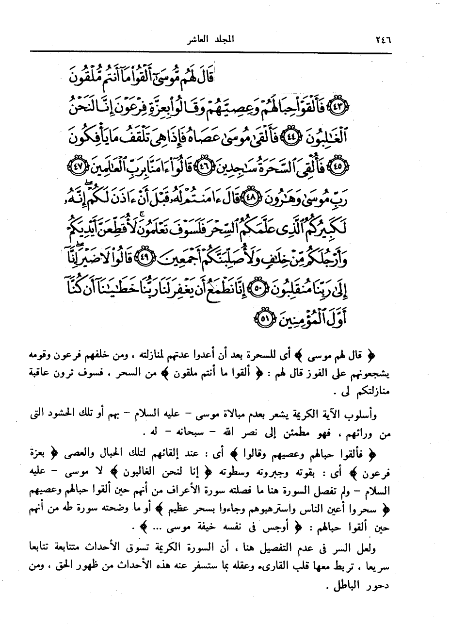 قالَ لَهُمْ مُوسى أَلْقُوا ما أَنْتُمْ مُلْقُونَ (43) فَأَلْقَوْا حِبالَهُمْ وَعِصِيَّهُمْ وَقالُوا بِعِزَّةِ فِرْعَوْنَ إِنَّا لَنَحْنُ الْغالِبُونَ (44) فَأَلْقى مُوسى عَصاهُ فَإِذا هِيَ تَلْقَفُ ما يَأْفِكُونَ (45) فَأُلْقِيَ السَّحَرَةُ ساجِدِينَ (46) قالُوا آمَنَّا بِرَبِّ الْعالَمِينَ (47)