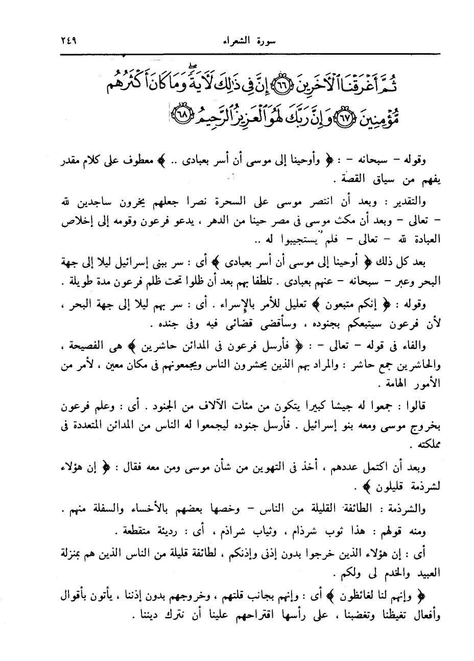 بعد كل ذلك أَوْحَيْنا إِلى مُوسى أَنْ أَسْرِ بِعِبادِي أى: سر ببني إسرائيل ليلا إلى جهة البحر وعبر- سبحانه- عنهم بعبادي. تلطفا بهم بعد أن ظلوا تحت ظلم فرعون مدة طويلة.