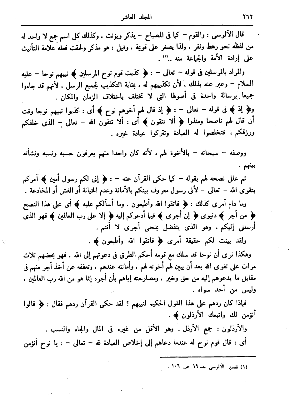 والمراد بالمرسلين في قوله- تعالى-: كَذَّبَتْ قَوْمُ نُوحٍ الْمُرْسَلِينَ نبيهم نوحا- عليه السلام- وعبر عنه بذلك، لأن تكذيبهم له، بمثابة التكذيب لجميع الرسل، لأنهم قد جاءوا جميعا برسالة واحدة في أصولها التي لا تختلف باختلاف الزمان والمكان.
