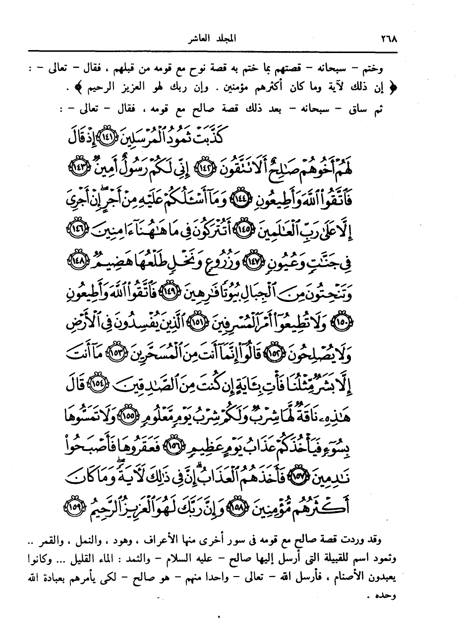 كَذَّبَتْ ثَمُودُ الْمُرْسَلِينَ (141) إِذْ قالَ لَهُمْ أَخُوهُمْ صالِحٌ أَلا تَتَّقُونَ (142) إِنِّي لَكُمْ رَسُولٌ أَمِينٌ (143) فَاتَّقُوا اللَّهَ وَأَطِيعُونِ (144) وَما أَسْئَلُكُمْ عَلَيْهِ مِنْ أَجْرٍ إِنْ أَجْرِيَ إِلاَّ عَلى رَبِّ الْعالَمِينَ (145)