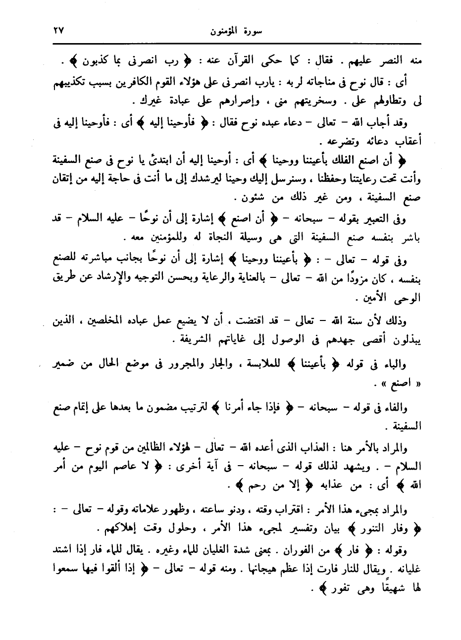 وقد أجاب الله- تعالى- دعاء عبده نوح فقال: فَأَوْحَيْنا إِلَيْهِ أى: فأوحينا إليه في أعقاب دعائه وتضرعه.